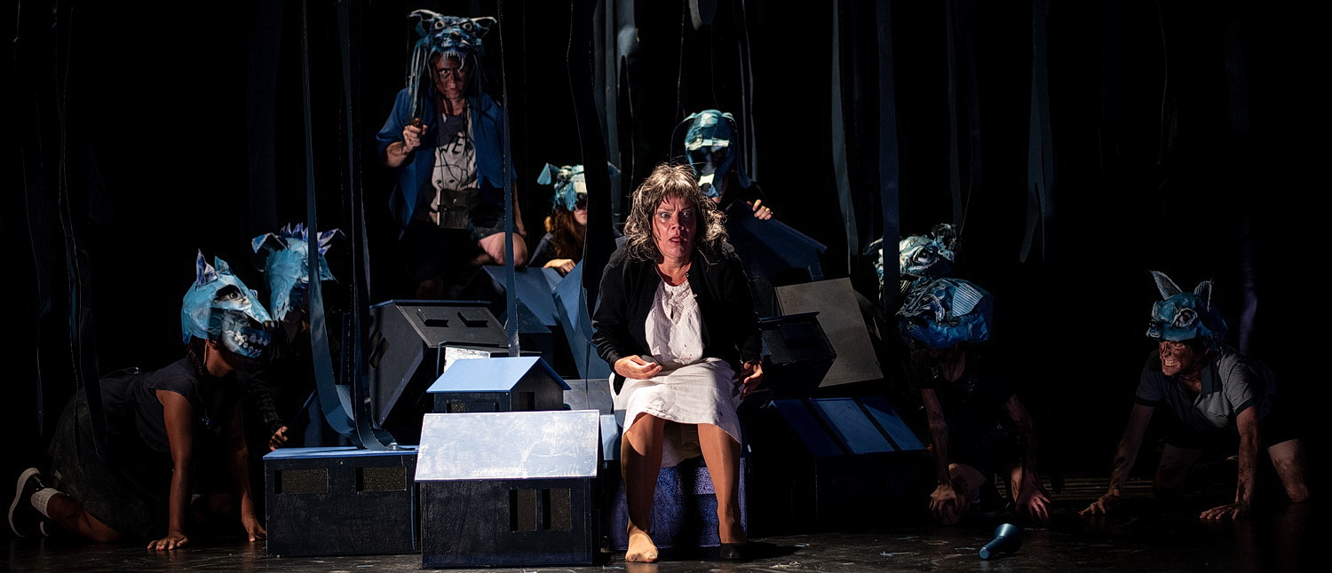 Es gibt eine Menge Sollbruchstellen, an denen aus der Geschichte Horror, ein kritischer Gesellschaftsroman oder gar eine Parabel hätte werden können. Nichts dergleichen geschieht. Die Handlung bleibt so platt, wie sie ist. Daran ändern auch Bühnenbild und Kostüme von Anike Sedello nichts. Ihr Faible für Blautöne steht im Gegensatz zur Symbolik des Abends. Von Hoffnung ist nichts zu spüren. Das Bühnenbild mit seinen Miniaturhäusern, die erst in Dorfform, später als „Trutzburg“ im Wald, der aus heruntergelassenen, baumähnlichen Gegenständen besteht, erschwert die Vorstellung, dass es sich bei diesem Stück um Theater für Erwachsene handelt.