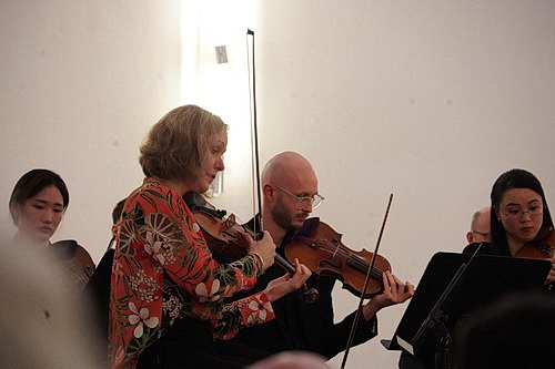 Wenn Shaw sich zu ihrem Entr’acte von Joseph Haydns letztem Streichquartett in F‑Dur inspirieren ließ, liegt es nahe, ein Werk des Meisters aus vergangenen Zeiten folgen zu lassen. Die Wahl fällt auf das Violinkonzert in C‑Dur mit dem Untertitel Fatto per il Luigi, für Luigi gemacht. Der italienische Geiger und Komponist Luigi Tomasini war Konzertmeister im Orchester der Esterházys im Burgenland, jenem Hof, an dem Haydn viele Jahrzehnte als Kapellmeister und Hauskomponist wirkte. Der Jungmusiker aus Pesaro dürfte sich in der Solisten-Rolle gefallen haben, bietet sie doch Möglichkeiten, sich zu profilieren, ohne es sich mit dem Orchester zu verscherzen. Van Keulen positioniert sich in der Mitte des Podiums, von wo aus sie leichterdings das Spiel des Tomasini übernimmt und ihre Musiker mit kleinen Gesten motiviert. Das sieht so charmant und liebevoll, so angedeutet aus, dass man von Dirigat nicht sprechen mag.