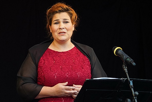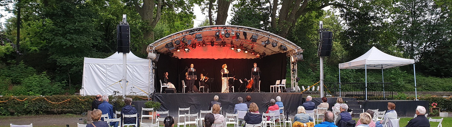 Zu dem einen Arien­abend im Kultur­garten setzt Désirée Brodka mit Freunden wirklich das klassische Standard­pro­gramm schlechthin auf. Die Sopra­nistin ist Inten­dantin der Oper im Espresso-Format. Eine besondere Form der Open-Air-Oper, bei der vier Sänger in Begleitung eines Streich­quar­tetts in rund 90 Minuten die Essenz einer Oper mit minimalen Mitteln vortragen. Da versammeln sich bei freiem Eintritt schon mal leicht tausend Zuschauer und mehr unter freiem Himmel, um einer solchen Aufführung beizu­wohnen. In der jüngeren Vergan­genheit haben sich die Opern­ar­beiter aller­dings auf Senio­ren­heim­kon­zerte kapri­ziert. Und so ist die Freude groß, auch wieder einmal öffentlich auftreten zu dürfen. Wer aller­dings gehofft hatte, Brodka singen zu hören, sieht sich an diesem Abend enttäuscht. Und hat vielleicht den größeren Gewinn gezogen. Denn Brodka darf zwar auf medizi­ni­schen Rat hin nicht singen, aber sprechen. Und so kann sie sich ganz auf die Moderation des Abends konzen­trieren. Das gelingt ihr ganz fabelhaft. Ohne von Kärtchen abzulesen, führt sie locker-leicht durch den Abend, ordnet die vorge­tra­genen Arien in den Opern- oder Operet­ten­zu­sam­menhang ein und hat auch einige Anekdoten mitge­bracht. Sehr charmant stellt sie das Streich­quartett vor, das heute Abend nicht nur Hinter­grund­be­gleitung ist, sondern selbst einen Musik­genuss darstellt. Laura Knapp und Antonio Mallach bringen ein bezau­berndes Geigen­spiel zu Gehör, Maria Zemlicka veran­lasst die Bratsche zur Imitation der mensch­lichen Stimme, was sie ja bekanntlich am besten kann, und Dan Zemlicka sorgt für die tiefen Töne auf dem Cello. Alle vier arbeiten laut Brodka haupt­be­ruflich solis­tisch, finden aber hier in wunder­baren Kontext.