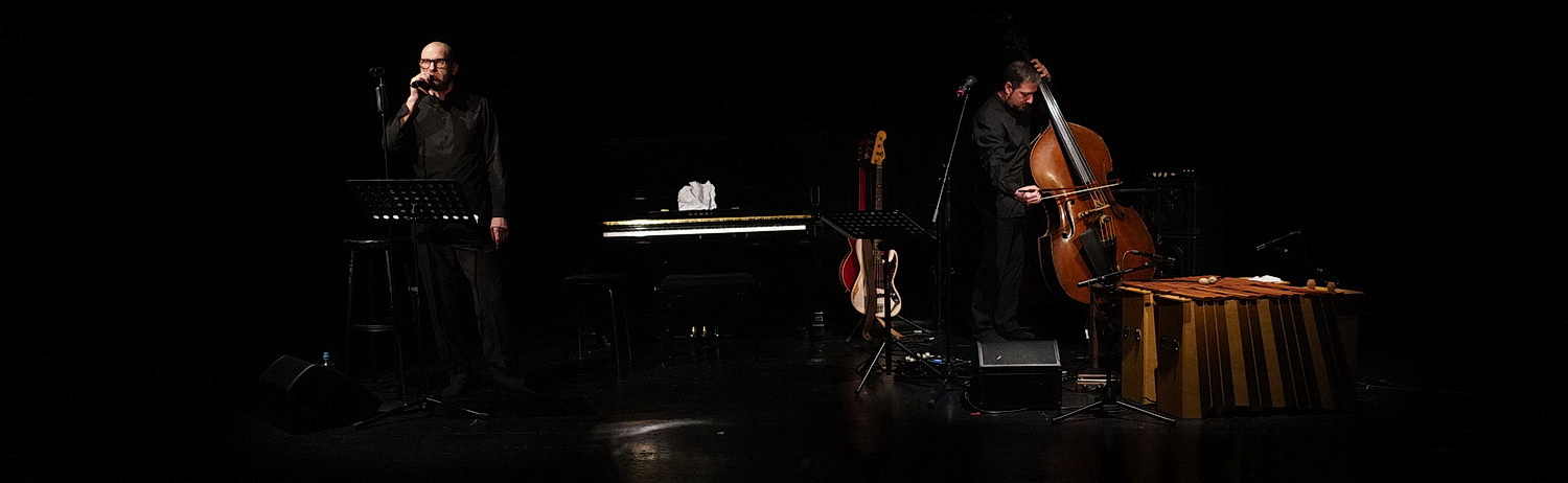 Zwar bleibt der Ansturm eines Komödienabends aus, aber immerhin ist das Studio gut besucht. Die Bühne kommt ohne jeden Schmuck aus. Die dort aufgebauten Instrumente sind an sich schon eindrucksvoll. Das Klavier ist „falsch herum“ aufgebaut, so dass der Spieler mit dem Rücken zum Publikum sitzen muss. Daneben stehen E‑Gitarre und E‑Bass, eine Bouzouki und ein Kontrabass, davor ist Platz für ein Xylophon. Alles ordentlich verkabelt und damit elektronisch verstärkt. Auch die Stimmen werden mit Mikrofonen verstärkt. Wenige Scheinwerfer setzen die Szene eindrucksvoll, aber punktgenau ins rechte Licht. Und man darf es vorwegnehmen: Die Technik leistet hochpräzise Arbeit auch dann, wenn die Mikrofonierung an ihre Grenzen gerät.