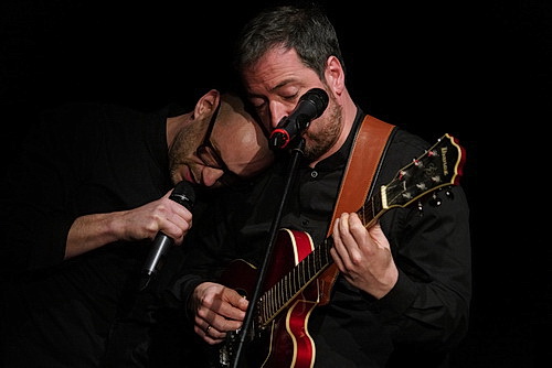 Die Aufführung beginnt mit Nie geboren von Nico Suave am Klavier. Wer danach eine Begrüßung oder Erläuterung erwartet, wird enttäuscht. Gruß- und wortlos geht es durch den Abend. Das nimmt der Aufführung viel an möglicher Nähe, die ihr Titel doch impliziert. Stattdessen geht es weiter mit In diesem Moment von Roger Cicero im Arrangement für E‑Gitarre und Stimme. Wie auch bei den folgenden Arrangements gefällt, dass Kamp sich sehr zurücknimmt und tatsächlich auf die Begleitung konzentriert. Wenn Waros sich auf gesangliche Ausflüge wie ins Falsett einlässt, gerät er für das geschulte Ohr an gefährliche Grenzen. Aber schließlich ist das eine Darbietung von Popsongs wie Woran hältst du dich fest, wenn alles zerbricht der 28-jährigen Ravensburger Sängerin Lotte und kein Operngesang. Und die Stimme reicht, das Publikum emotional zu erreichen. 17 Lieder haben die beiden mitgebracht, die Waros voneinander abgrenzt, indem er bedeutungsvoll ein bis drei Töne auf dem Klavier anschlägt. Hier wäre der Platz gewesen, etwas über die Lieder zu erzählen. Dann hätten auch die älteren Besucher möglicherweise erfahren, dass es sich großenteils um brandaktuelle Pop-Songs handelt wie das Narbenherz von Michél von Wussow, der Aufstehmensch von Alexa Feser oder 5 Meter Mauern der Gruppe Elen, deren Song durch die Interpretation eines 18-Jährigen in einer Fernsehshow im vergangenen Jahr ungeheure Popularität bei den Jugendlichen erfuhr.