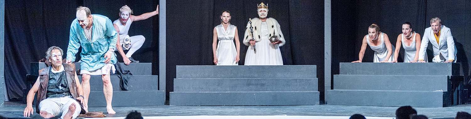 Mit Erik Roßbander einen King Lear zu erarbeiten, muss ein Füllhorn an Möglichkeiten darstellen. Eine Andeutung davon ist an diesem Abend zu spüren. Cordelia wird hier als verstörte Cordelia interpretiert, die schließlich als Jeanne d’Arc autistische Züge annimmt. Theresa Rose nimmt dazu Positionen ein und verharrt darin. Und sie bekommt keine Möglichkeit, ihre Wut über eine derart eindimensionale Darstellung zu äußern. Mit Svea Maiken Auerbach als Goneril und Petra-Janina Schulz als Regan hat Freytag zwei großartige „böse“ Schwestern zur Verfügung. Die steifen Auftritte zeigen keinen Hochmut, sondern Einfallslosigkeit des Regisseurs. In Bruchteilen von Momenten dürfen die Schauspielerinnen zeigen, dass da viel mehr möglich gewesen wäre. Ein wahrer Lichtblick ist Tobias Dürr als Narr und Kent, die bei fehlenden Kostümwechseln kaum auseinanderzuhalten sind. Aber das ist zu diesem Zeitpunkt auch schon egal. Peter Lüchinger stellt den Grafen Gloucester dar, der sich weiße Schminke über die Augen schmiert, um zwei herausgerissene Augen zu zeigen. Dank seiner Überzeugungskraft nimmt man ihm das ab, obwohl das wirklich weniger als das Minimum an Dramatik ist. Gleich vier Rollen übernimmt Markus Seuß und befindet sich damit im Umkleide-Stress. Er übernimmt das mit der nötigen Professionalität und schafft damit noch weniger Versprecher als die anderen. Tim Lee sorgt in seiner Sterbeszene als Edmund gar für unfreiwillige Lacher. Für ein Drama dann wohl das endgültige Todesurteil.