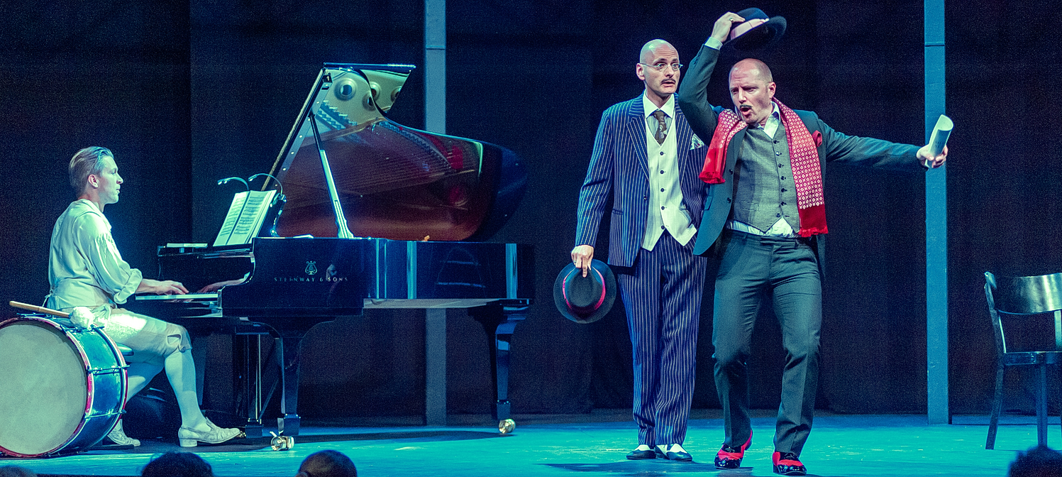 Es mag durchaus sein, dass schon die gelungene Eröffnung für das richtige Klima sorgt. Denn für diesen Abend hat das Opern­studio den Schau­spieler Moritz Führmann verpflichtet. Schon mit dem Vortrag von Sonett Nummer acht und dem Monolog Die ganze Welt ist Bühne fesselt Führmann die Besucher, ehe Maria Boiko und Andrés Sulbarán ihr erstes Duett aus der selten gezeigten Oper Béatrice et Bénédict von Hector Berlioz vortragen. Beide wie die anderen Opern­studio-Teilnehmer auch in luftiger Leinen­be­kleidung, die an Shake­speare erinnern soll. Stefanie C. Salm hat die Kostüme ausge­wählt, von denen auch gleich noch einige an einer Garde­ro­ben­stange im Hinter­grund der Bühne hängen. Davor ist ein kleiner Tisch mit zwei Stühlen platziert. Auf der anderen Bühnen­seite ist der Flügel und ein weiterer Stuhl unter­ge­bracht. Das muss an Requi­siten reichen. Boiko und Sulbarán zeigen gleich mit Comment le dédain pourrait-il mourir? auch, wie schön das funktio­niert. Mit ausge­wo­gener Bewegung und gegen­sei­tigem Blick­kontakt entsteht ein ausge­gli­chener Gesamt­ein­druck, der fast über den gesamten Abend beibe­halten wird. Dazu tragen auch die wenigen Licht­ef­fekte von Volker Weinhart bei, der stimmungsvoll, aber zurück­haltend leuchtet.