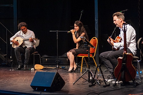 Als erste tritt Simav Hussein in Begleitung zweier Musiker auf. Hakan Akay ist Musikproduzent und verspricht Hussein eine große Zukunft. In Neuss begleitet er die junge Sängerin, die erst vor drei Jahren aus ihrer kurdischen Heimat nach Deutschland kam, auf einer europäischen Laute und einer Tanbur, einer orientalischen Langhalslaute. Roland Büttgen sekundiert ihm auf der Gitarre. Und wenn Hussein Lieder aus ihrer früheren Heimat sind, klingt das wirklich wunderschön. Was sich hinter Titeln wie Dêra Sorê, Batmanê, Reya Kubarê, Xanim oder Xelet im verbirgt, erfährt der deutschsprachige Besucher nicht. Bei der Zugabe immerhin ist sich das Publikum einig, und mit ein wenig Widerwillen lässt sich Hussein darauf ein, Şervano zu singen. Vielleicht liegt ihr ergebenes Schulterzucken daran, dass es sich hier um ein Lied für den Widerstand gegen die türkische Invasion in Rojava handelt, das in der Nacht der Militäraktion am 9. Oktober vergangenen Jahres entstand und seither auf Beerdigungen, auf Demonstrationen und an der Front gespielt wird. Nichtsdestotrotz berührt ihre Interpretation die Herzen des Publikums. Gern hätte man von der jungen Frau mehr erfahren, deren Videos bei YouTube immerhin hunderttausende Menschen erreichen, aber mit der Kommunikation hapert es deutlich. Im Internet erfährt man nichts von ihr. Hier sollte Hussein schnellstens nachbessern, um auch das deutsche Publikum zu erreichen. Denn das zeigt dieser Abend: Ihr Gesang kommt auch bei den Deutschen sehr gut an.