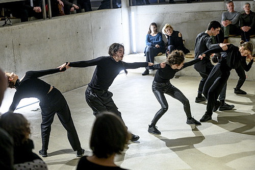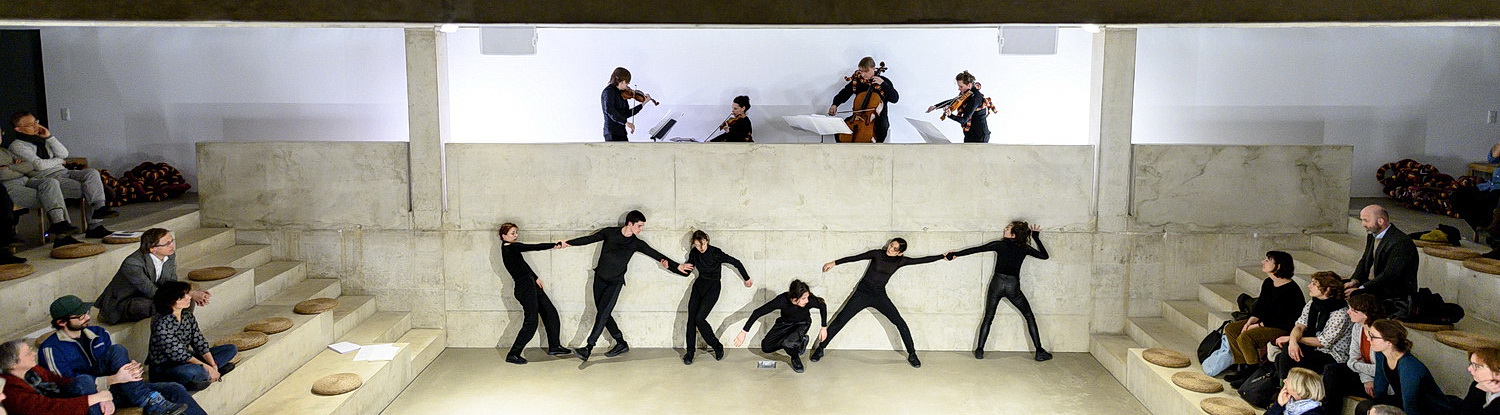 Thiersch lässt die vier Tänze­rinnen und zwei Tänzer zunächst immer wieder zu Skulp­turen erstarren, die ihre Partner in vorge­formten Haltungen aufnehmen. Ein überra­schender Effekt, der neuer­dings häufiger in Choreo­grafien auftaucht und gewis­ser­maßen als Umkehr­schluss sehr inter­essant wirkt. Legen die Tänzer zunächst ihre Bewegungen noch in die Spiel­pausen, verquicken Tanz und Musik zunehmend. Zwischen­zeitlich treten die Tänzer auch in direkten Dialog mit den Musikern. Die Körper­sprache wird zunehmend gruppen­dy­na­mi­scher. Bis hin zu geradezu akroba­ti­schen Übungen, bei denen auch die Wände mitein­be­zogen werden.