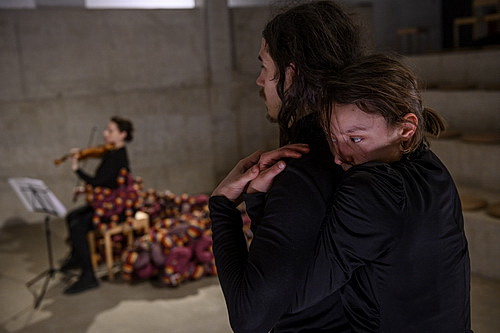 So gelungen die Choreo­grafie auch Musik und Tanz mitein­ander verstrickt, fällt es mitunter schwer, das Werk ganzheitlich zu betrachten. Rostislav Kozhev­nikov, Barbara Streil, Justyna Sliwa und Teemu Myöhänen vom Asasello-Quartett ziehen sich zwischen­zeitlich auf die „Empore“ hinter eine halbhohe Mauer zurück und geraten dadurch schon visuell in den Hinter­grund. Da wird aus der Musik genau das, was vermieden werden sollte: Hinter­grund­musik. Ärger­licher ist aller­dings, dass der Zuschauer mit seinen Eindrücken orien­tie­rungslos gelassen wird. Welche Urauf­führung die Musiker da gerade spielen, kann er nicht einmal erahnen, zumal die Reihen­folge der Stücke nicht mit dem dürftigen Abend­zettel überein­stimmt und kurze Stücke von Györgi Ligeti eingefügt werden, die gar nicht erst im Programm auftauchen. Allen­falls die Stand­ort­wechsel des Streich­quar­tetts sorgen für eine gewisse Struktur.