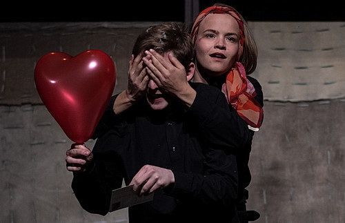 Auch für die Bühne wurde das Werk schon verschiedentlich bearbeitet. Jetzt hat Maik Priebe eine eigene Fassung geschrieben, die er am Rheinischen Landestheater Neuss inszeniert und dabei auch gleich Bühnen- und Kostümbild übernommen hat. Die Besucher im nicht annähernd voll besetzten Großen Saal bekommen ein statisches Bühnenbild zu sehen. In der Bühnenmitte sind Stofflagen im „Lumpenlook“ übereinandergeschichtet und bilden so eine Art Sparring-Raum mit unsicherem Boden. Nach hinten wird diese Spielfläche mit einem Paravent abgeschlossen. Rechts und links gibt es jeweils drei Stühle, ein paar Mikrofone und jede Menge Requisiten. Die Darsteller sind einheitlich in Schwarz gekleidet. Die Mutter bekommt eine Schürze, Sigmund Freud erst einen Hut, später nur noch einen angeklebten Bart und das fehlende Bein des Trafikanten wird dadurch angedeutet, dass das eine Hosenbein hochgezogen wird. Priebe versucht erst gar nicht, eine bestimmte Atmosphäre wie etwa in der Trafik oder im Nachtclub aufzubauen. Gespielt wird so gut wie gar nicht. Die Liebesnacht von Franz und Anezka gerät so zu einem pubertären Gerangel. Stellungswechsel werden bevorzugt vollzogen, um die Darsteller für ihren nächsten Texteinsatz zu positionieren. Der besondere Regie-Einfall ist, dass die Darsteller auch als Geräuschemacher fungieren. Mit dem Nachteil, dass erst die Geräusche zu leise sind, später die Darsteller kaum zu verstehen sind. Auch die musikalischen Einsprengsel von Stefan Leibold wirken akustisch mitunter unausgewogen. Davon abgesehen gilt für Priebe: Volle Konzentration auf den Text. Schlösse man von Anfang bis Ende die Augen, hätte man den Abend vollständig erfasst. Aber geht man ins Theater, um ein Hörspiel geboten zu bekommen?