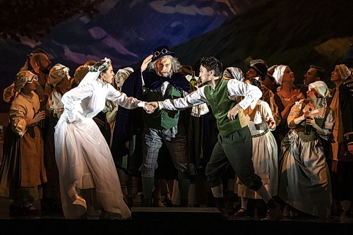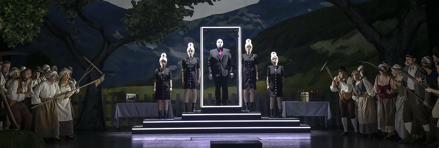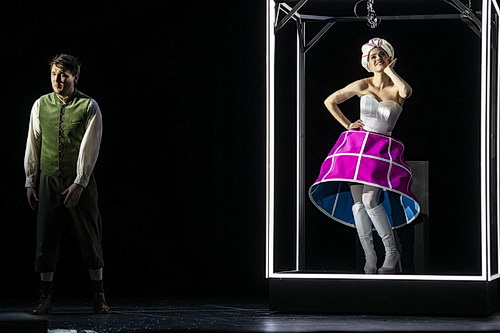 Der echte Dulcamara scheint überflüssig zu sein, er beobachtet das Geschehen nur noch aus der Ferne und überlegt, sich den Strick zu nehmen, während Dulcamara 2.0 etwas Diabolisches an sich hat, wenn er wie ein Mephisto wieder einmal im Bühnenboden verschwindet, um dann, Champagner trinkend, aus der Proszeniumsloge heraus die Hochzeit von Adina und Belcore zu inszenieren, die natürlich live per Video übertragen wird. Erst durch Nemorinos große Arie Una furtiva lagrima erkennt Adina die wahren Werte des Lebens und der Liebe, die nicht auf Schein und auf Follower-Zahlen ausgerichtet sind, sondern die Persönlichkeit des Menschen in den Vordergrund stellen. Und dann ist der futuristische Spuk vorbei, man befindet sich wieder in der alten, klassischen Geschichte, und dem Happyend der beiden steht nichts mehr im Wege, während Belcore einen neuen Versuch bei Adinas Freundin Gianetta startet.