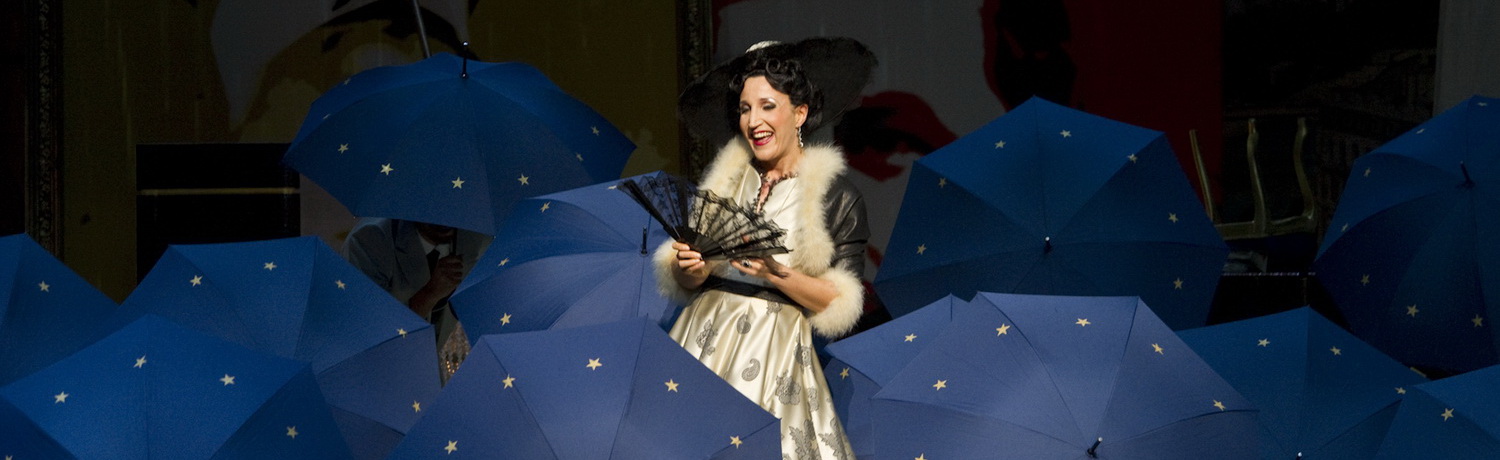 Das Geschehen beginnt mit einem Saxophon-Solo vor dem Vorhang, das große Duett Lippen schweigen wird hier zur Einstimmung schon mal intoniert. So weit, so gut. Dass der Saxophonist aber eindeutig als Karl Marx charakterisiert ist, lässt schon ein wenig nachdenken. Zettelt Marx hier eine musikalisch-kommunistische Reform an? Werden die Sorgen Pontevedrinos einfach mit dem Saxophon weggeblasen? Es ist ja nicht nur das Intro vor der Ouvertüre, sondern dieser Marx taucht immer wieder auf, spielt passend zur Szene eine entsprechende Melodie und verschwindet dann wieder. Ein musikalischer Beobachter? Oder einfach nur ein Gag des Regisseurs ohne tiefere Bedeutung? Man weiß es nicht. Im Programmheft findet sich auch keine Lösung, stattdessen eine Abhandlung der Dramaturgin Christina Schmidl über die Frage, ob Die Lustige Witwe nun Hitlers Lieblingsoperette war. Also doch eine politische Inszenierung? Nicht wirklich, zumindest ist keine Anspielung auf das so genannte Dritte Reich vorhanden. Sehr wahrscheinlich versteht das Staatstheater diese Abhandlung als Bildungsauftrag, auch wenn das mit der aktuellen Inszenierung nun gar nichts zu tun hat. Wenn es überhaupt politisch wird, so scheint Enzinger ein echter Europäer zu sein. Die blauen Regenschirme mit den vielen goldenen Sternen wie die Europaflagge schützen die Glawari bei ihrem ersten Auftritt vor dem vermaledeiten Regen. Und später steigen beim Fest der Pontevedrinischen Gesellschaft blaue Luftballons mit goldenen Sternen in den Bühnenhimmel. Politisch ganz aktuell wird es, wenn Baron Zeta von „Fake-News“ schwadroniert oder im besten Donald-Trump-Stil „Pontevedrino first“ ruft. Das mag lustig klingen, ist es aber nicht und wirkt wie so vieles in der Inszenierung aufgesetzt und gekünstelt.