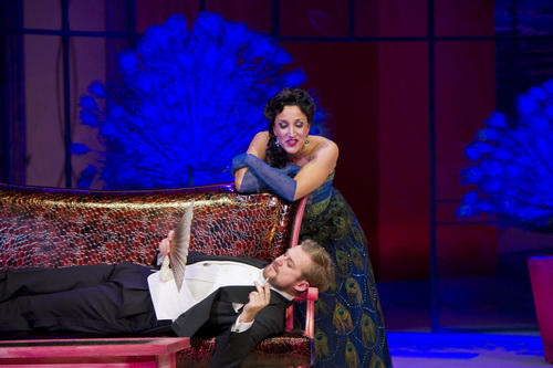 Franz Lehárs Klassiker Die Lustige Witwe schwankt in der jüngeren Inszenierungsgeschichte oft zwischen Kitsch, Klamauk oder modernem Regietheater, das jedwede Romantik vermissen lässt. Regisseur Thomas Enzinger, seit diesem Jahr Intendant des Lehár-Festivals in Bad Ischl, hat sich jetzt in Nürnberg zusammen mit seinem langjährigen Bühnen- und Kostümbildner Toto das Meisterwerk Lehárschen Schaffens, Die Lustige Witwe, vorgenommen. Nach dem famosen Erfolg ihrer gemeinsamen Inszenierung Im Weißen Rössl vom vergangenen Jahr ist die Erwartungshaltung natürlich sehr hoch, doch ganz geglückt kann man diese Inszenierung nun wirklich nicht bezeichnen. Enzinger bedient sich gängiger Operettenklischees, zieht so manche abgedroschene Schublade, und überrascht dann wiederum durch Momente, die aufhorchen lassen.