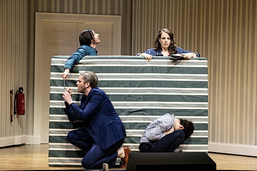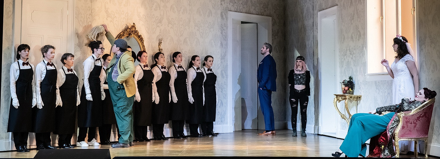 So entwickelt sich die Handlung, mal bedrückend, mal humorvoll. Die obligatorische Szene, in der Cherubino, hier noch mit Schnauzbart, sich unter der Matratze im Zimmer von Susanna und dem Grafen verstecken muss. Das Lied, das Cherubino für die Gräfin geschrieben hat, wird von Susanna mit dem Smartphone aufgenommen, man ist in der Welt der sozialen Medien angekommen. Der Gesangslehrer Basilio ist ein schmieriger Kerl mit Lars-Eidinger-Frisur, Marcellina der Typ Gouvernante ohne Gefühlsregungen. Bartolo ist schwer herzkrank und kann keine Intrigen mehr spinnen, und der Notar Don Curzio ist eine stotternde Karikatur des Winkeladvokaten, ähnlich wie die Figur des Dr. Blind in der Fledermaus von Johann Strauss.