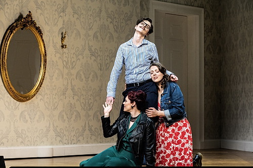 Zur Ouvertüre ist der Vorhang schon geöffnet, die Bühne ist abgedunkelt, die Räume sind noch geschlossen, und man sieht eine junge Frau, Typ Punkerin und oder Junkie, die sich gelangweilt eine Zigarette ansteckt. Später wird das Publikum wissen, das ist Barbarina, die Tochter des Gärtners Antonio. Susanna, in einem rotgetupften Kleid und Jeansjacke gewandet, erscheint und steckt sich ebenfalls eine Zigarette an. Das ist leider so eine Unart, die immer mehr bei Inszenierungen in der Jetztzeit Einzug hält, das unnötige Rauchen auf der Bühne. Das soll cool wirken, ist aber nicht zeitgemäß, wenn auch ein deutlich jüngeres Publikum angesprochen werden soll. Im Verlauf der Ouvertüre erscheinen alle Protagonisten auf der Bühne, um dann nach kurzen Pseudodialogen wieder zu verschwinden. Das nimmt so etwas den Zauber der Ouvertüre. Wenn sich dann zum ersten Akt die Räume öffnen, sieht man im linken Raum Almaviva im blauen Anzug und schwarzem Hemd gedankenverloren das Familienporträt betrachten. Der Raum ist mehr geschäftsmäßig eingerichtet, während Rosina im rechten Raum eleganter eingerichtet ist, und auch ihr grüner Hosenanzug mit schwarzer Lederjacke zeugt von einem eigenen Stil. Statt Businesssessel ein eleganter Sessel mit Brokatüberzug. Es sind diese optischen Kleinigkeiten, die zeigen, wie weit das Ehepaar sich auseinandergelebt hat.