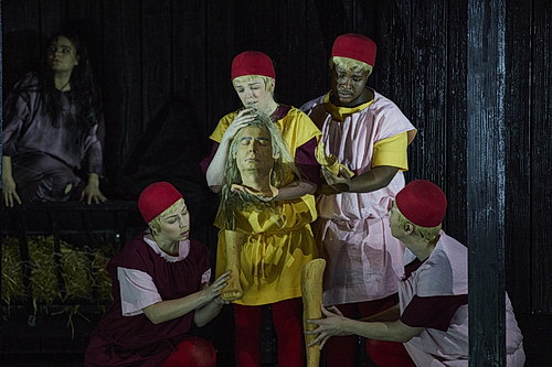 Parsifal dagegen erscheint in moderner Kleidung, mit einem braunen Hoody, brauner Hose und Boots. Zu Beginn der Verwandlungsmusik folgt der nächste Showeffekt, der an unpassender Stelle unnötige Unruhe ins Publikum bringt. An zwei langen Seilen, die vom Bühnenrand zur Decke im Rang gespannt sind, wird ein großes weißes Segel über die Zuschauer herabgelassen, um dann die Holzhütte komplett zu verhüllen. Technisch gut gemacht, stört aber natürlich die Musik. Titurel ist hier als halbtoter Greis mit Krone dargestellt, und ähnelt mit seinem Outfit mehr dem Wassermann aus Rusalka als an einen ehemaligen Gralskönig. Er richtet sich quasi aus dem Schattenreich des Todes auf, und bewegt sich wie ein Zombie. Vielleicht mag Regisseur David Hermann die Serie Walking Dead, da könnte eine solche Figur locker mitspielen. In jedem Fall hat sich hier die Maske ein Sonderlob verdient. Dann wird das weiße Segel nach hinten gezogen, die Holzhütte wird mit Neonröhren illuminiert, und der Gral ist in einem erleuchteten Schrein, ohne das man ihn genauer sieht. Die Gralsritter ziehen allesamt an diesem Schrein vorbei und schauen glücklich in das Licht. Von Brot und Wein, von dem der Chor singt, ist nichts zu sehen, die christliche Liturgie wird von Herrmann ausgespart.