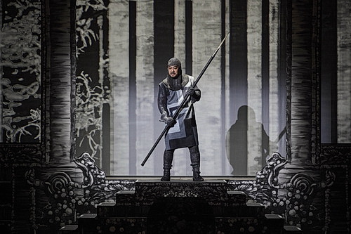 Gurnemanz ist hier nicht der väterliche, balsamische Greis, sondern ein viriler und durchaus aggressiver Gralsritter, ein Primus inter Pares. Bevor Kundry ihren ersten Auftritt hat, rasen einige Doubles von ihr durchs Opernhaus, um fast zeitgleich an verschiedenen Orten aufzutauchen. Amfortas, mit einem halboffenen, weißen Gewand und einem roten Mantel bekleidet, tritt hier nicht als siechender, tödlich verwundeter Gralskönig auf, der nicht sterben kann, sondern mehr als tyrannischer Despot, der sich in seinem Leiden suhlt. Gurnemanz öffnet während seiner langen Erzählung eine Tür der Holzhütte und man sieht eine stilisierte Kundry neben einem Amfortas-Torso, der vom Speer getroffen ist. Das ist wieder mal typisches Fingerzeig-Theater, wo dem Publikum der Inhalt noch einmal plastisch vor Augen geführt wird, damit man auch ja den Sinn des Werkes versteht. Von der Bühne kommt dann eine teuflische Figur mit Flügeln herab und bringt den Gral, die Schale und den Speer genau an der Stelle, wo Gurnemanz erzählt, wie Amfortas diesen an Klingsor verloren hat. Und so ist der erste Aufzug sehr symbolüberladen.