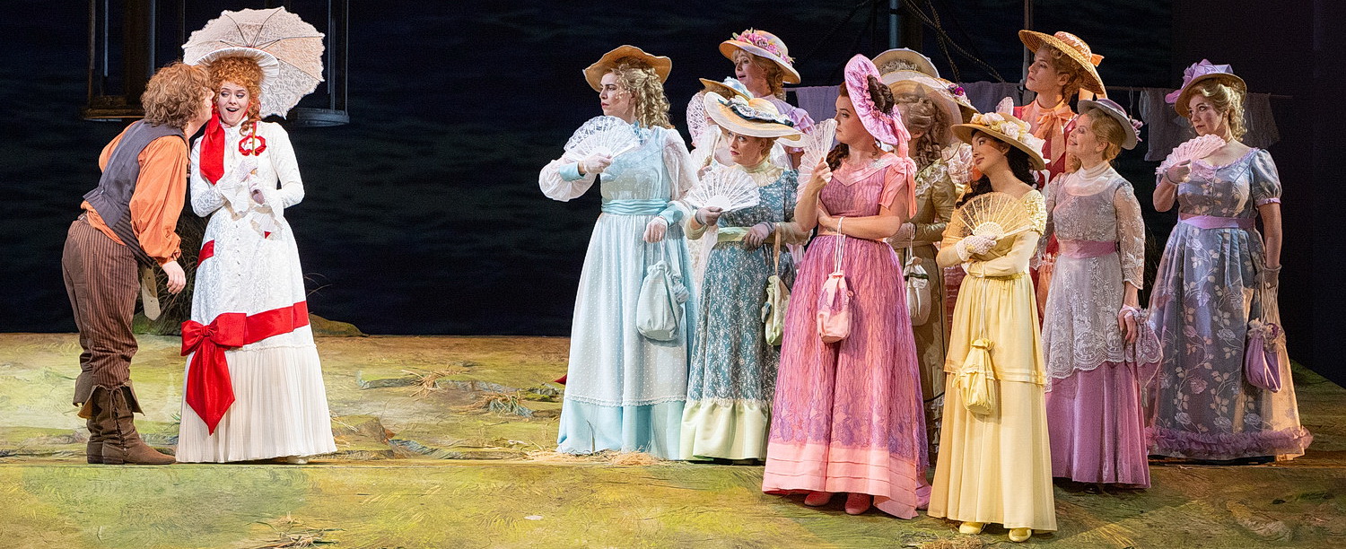 Hier muss man nichts ernst nehmen in dieser Quasi-Operette, die eine melodramatische Oper auf die Schippe nimmt und nach ihrer Uraufführung 1879 auch heute immer wieder gespielt wird. Die Inszenierung von Christian Brey lässt das viktorianische Zeitalter noch ungefähr ahnen, transportiert aber die im Grund völlig unsinnige Handlung nicht in die Gegenwart; er erinnert dabei an heute noch gängige romantische Vorstellungen von hochherzigen Piraten und züchtigen, hübschen Töchtern in englischen Gesellschaftsromanen voriger Jahrhunderte. Schon die Geschichte ist haarsträubend: Ein „ausgebildeter“ Pirat, ein „Sklave der Pflicht“, will nach seiner „Lehrzeit“ bei den Seeräubern diesen „Beruf“ aus moralischen Gründen verlassen, sieht zum ersten Mal Mädchen, verliebt sich in die vom Himmel herabschwebende Mabel, und nach einigen Hindernissen, nämlich dem Irrglauben, dass er als am 29. Februar Geborener die Begehrte erst nach erlangter Volljährigkeit, also nach 63 Jahren heiraten dürfe, und nach einem Kampf der heldenmütigen Piraten gegen angsterfüllte britische Polizisten geht alles gut aus: Er kriegt Mabel, und auch die übrigen Töchter des trotteligen Generalmajors bekommen je einen Mann aus der Single-Schar der Piraten ab. Alles löst sich in Wohlgefallen auf. Zur amüsanten Unterhaltung verhilft ebenso die neue, witzige Übersetzung des Textes von William Schwenck Gilbert durch Inge Greiffenhagen und Bettina von Leoprechting. Unterstützt wird die komödiantische Wirkung noch durch die Ausstattung von Anette Hachmann: Gleich zu Anfang nähert sich ein Segelschiff auf Meereswellen der Küste, wo Schafe weiden. Später, bei Nacht im Garten des Anwesens von Generalmajor Stanley ist in der Ferne die See unter einem sternenübersäten Himmel mit Riesenmond zu sehen; die ordentlich aufgereihten Zypressen dienen als Versteck für fluchtbereite Polizisten, nur die Lampen gefährden durch mögliche Kurzschlüsse unaufmerksame Sergeanten. Ein krächzender Papagei auf der Schulter von Alt-Pirat Smee darf Kommentare abgeben, eine behaarte Brust zeichnet Helden aus, und der Generalmajor in roter Uniform erinnert irgendwie an den alten Kaiser Franz Joseph mit seinem Backenbart. Die Piraten entsprechen in ihrem Äußeren all dem, was wir aus Abenteuerfilmen kennen, die liebreizende Mädchenschar aber in pastellfarbenen Kleidern mit Sonnenschirm, Hut und Fächer zeigt sich, wenn auch züchtig, doch verschämt neugierig auf Männliches; im zweiten Akt kümmern sich die Töchter, in weißen Nachthemden und Betthauben, hauptsächlich um ihren senilen, schlafmützigen Vater. Die einfallsreiche, lebendig bewegte Regie sorgt für auf den Takt genaue, klirrende Degengefechte. Dass aus der biederen, hausfraulichen Ruth bald eine Art kampfbereite Seeräuber-Jenny wird, verwundert bei solchen Unsinns-Verwicklungen nicht.