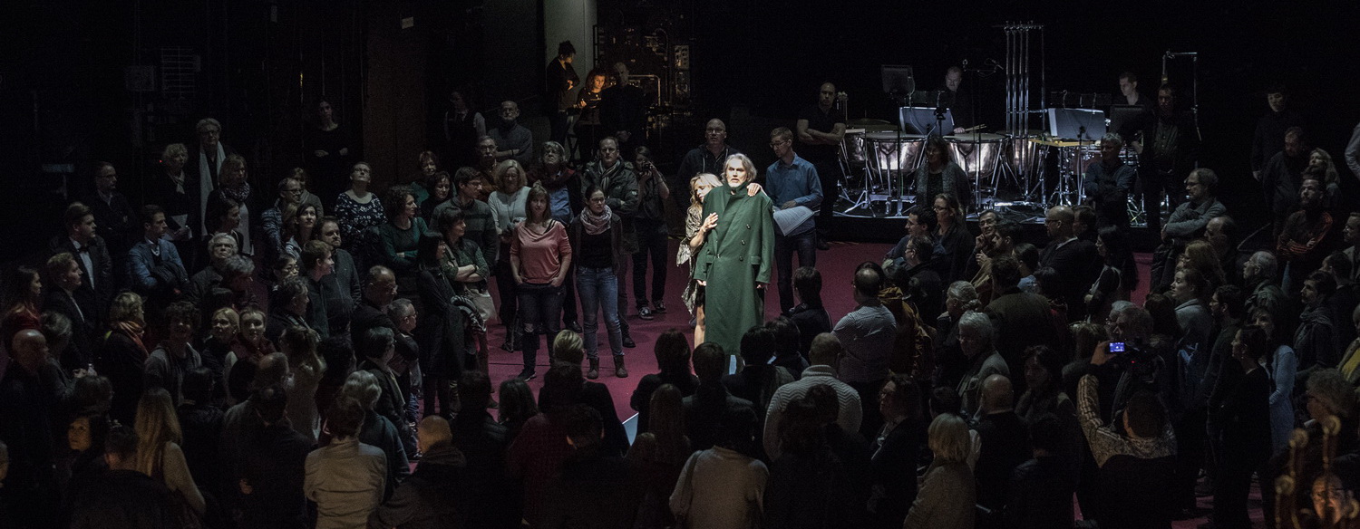 Dabei beginnt das Werk musika­lisch geradezu gewalt­tätig, mit dumpfen, stumpfen Pauken­schlägen im Preludio, die wellen­artig auf- und abschwellen, ein lautes, in sich aber sehr wohl struk­tu­riertes, wüstes Klang-Tableau, das sich schließlich scheinbar beruhigt, flirrend Zwitscherndes hören lässt und fast sehnsuchtsvoll abebbt. Markus Bosch am Pult der Staats­phil­har­monie Nürnberg hält diesen riesigen Orches­ter­ap­parat souverän zusammen, lässt auch Diffe­ren­ziertes, Kammer­mu­si­ka­li­sches aufleuchten, und in den Zwischen­mu­siken sind unter der Oberfläche Zitate von Chorälen, von barocken Trompeten, Grego­rianik als Trümmer-Collage vergan­gener Musik-Tradition zu ahnen. Dabei forciert Bosch nie, sondern gibt auch, wie im unkon­ven­tio­nellen „Gewitter“, vor der inneren Unruhe der Marie, Trans­pa­rentem Raum. Die Überein­an­der­schichtung aller Stimmen und Motive im vierten Akt und die gespro­chenen Texte durch alle Mitwir­kenden von der umlau­fenden Beleuch­terbühne herunter heben das Drama auf eine weitere Ebene, schaffen eine irritie­rende Distanz, bereiten die Auflösung der Handlung, die Apoka­lypse vor.