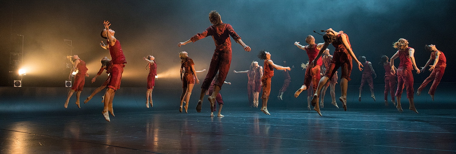 Eine Spur monumen­taler, kraft­voller, exzes­siver und abwei­sender ist die Musik zu Sacre, oft durch­pulst von einem stamp­fenden Rhythmus, beklemmend und packend von der Dirigentin und dem Orchester unmit­telbar gestaltet. Das Tanzge­schehen auf der Bühne von Eva Adler aber wirkt nicht so schockierend und gewalt­tätig. Montero lässt seine 21 Ensemble-Mitglieder alle in leicht verwa­schenem Rot auftreten, in oft zerschlis­sener Kleidung von Angelo Alberto, wobei eine ursprüng­liche Unifor­mierung zu ahnen ist, als Hinweis auf eine fast unter­ge­gangene Gesell­schaft; er nennt sie „postapo­ka­lyp­tisch“, auf der Suche nach einer „Entität“, also einer überge­ord­neten, kaum greif­baren Macht, hier symbo­li­siert durch einen monströsen Licht-Ring mit 40 so genannten „Moving-Lights“; dieser riesige Kranz senkt sich von oben herab, verströmt Energie, steht schief, und Gestalten der Gruppe wollen hindurch treten und so in eine andere, neue Dimension trans­for­miert werden, eine neue Existenz erlangen. Das ist ihr Bestreben. „Le Sacre du Printemps ist ein sozio­lo­gi­sches Ballett … Wir werden Zeuge der Bewegungen der Menschen zu einer Zeit, als er noch nicht als Individuum existierte“, merkte Jacques Rivière schon 1913 an. So lässt Montero seine Tänze­rinnen und Tänzer sich in Gruppen, Reihen formieren, als Schwarm ohne Leitung; auch als Paare haben sie keinen wirklichen Zusam­menhalt, trennen sich bald wieder; nur die Kolonne, der Kreis zählt. Dennoch sehnen sie sich nach einem, der sie befreit von ihrer Abhän­gigkeit von anderen, von der Verehrung eines irgendwie „Göttlichen“, das sie gemeinsam geschaffen haben. Also wählen sie zuerst einen Mann, Alexsandro Akapohi, vermutlich wegen seiner Stärke, und versuchen, ihn in den leuch­tenden Kreis zu schicken. Als der nichts ausrichtet, schubsen sie ihn herum, werfen ihn hoch, tun ihm Gewalt an, werfen ihn weg. Nur eine Frau, Sofie Verwaecke, nimmt sich des Ausge­sto­ßenen an, kümmert sich um ihn, legt sich auf ihn, hebt ihn auf, zeigt also Empathie. Sie ist die einzige, die im inneren Ring standhält, sich bis zur totalen Erschöpfung mit Sprüngen, Gesten, Rollen körperlich völlig verausgabt, auch mental. Ihr „Opfer“ für die Gruppe aber endet in einer Art Nichts: Sie kann die Einzel­gänger nicht zu Paaren zusam­men­schließen, sie aus ihrer Ich-Bezogenheit heraus­führen, und auch der Versuch, nach der Gottheit im Licht des Rings zu greifen, bleibt trotz extremer Streckung ohne Ergebnis. Der Ring verschwindet. Faszi­nierend aber bleibt die Energie, mit der die „Auser­wählte“ ihr Solo tanzt, mit fast berstender Spannung. Das Opfer einer Frau für die Gesell­schaft wird eigentlich in Frage gestellt im letztlich pessi­mis­ti­schen Schluss. „Was ich eigentlich zeigen will, ist, dass wir diese Opfer nicht brauchen, wenn wir über genügend Empathie verfügen; Fortschritt wurde nie durch Blutver­gießen und ähnliche Grausam­keiten erreicht, sondern durch Wissen und Vernunft“, sagt Montero dazu. Der Choreograf gibt also keine konkrete Deutung, sondern will zum Weiter­denken anregen.
