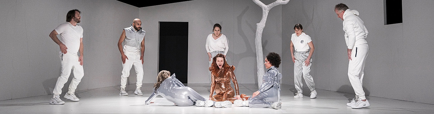 Bis dahin haben Susanne Burkhard, Agnes Lampkin und Lucija Romanewa als werdende Mütter Gelegenheit, in den glänzenden Ganzkörperanzügen, die Andrea Barba entworfen hat, ihre dicken Bäuche zu zeigen, um der Welt zu beweisen, wie leistungsfähig und stark sie sind. Da wird, wie es sich bei Shemesh gehört, marschiert, gestampft und getanzt, dass der Bühnenboden wackelt. Auch die Gesellschaft – Torsten Bauer, Niv Melamed, Ronja Oppelt, Daniel Rothaug und Luna Schmid sind in weiße Tennisdresses mit kurzen Hosen gekleidet – feiert die Schwangeren. Ob Sprechchöre oder Musik, Simon Bauer zeichnet hier verantwortlich, alles ist laut und dröhnend. Nichts kann diese Wand der Vorfreude durchdringen, egal auf welcher Ebene. Die Kinder, die schließlich entschlüpfen, sind, oh, Wunder, keine Schönheiten. Ihre Köpfe sind zu groß, der Schaumstoff erinnert eher an entstellte Fratzen.