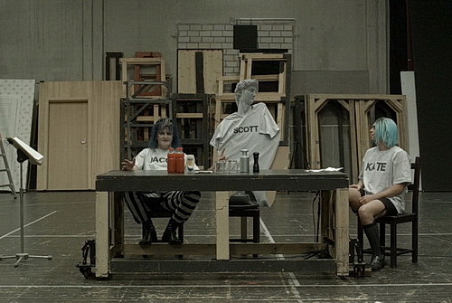 In zwei Stunden bekommt der Zuschauer Gelegenheit, die Produktion von der Befragung bis zum Schluss­vorhang zu verfolgen. Da in Oberhausen, Leipzig und Dresden gedreht wurde, wurde vielfach auf Origi­nal­schau­plätze verzichtet. Statt­dessen gibt es Hinter­grund­bilder aus der Green Box. Die Texte, die die Darsteller in der ersten Hälfte aufsagen, spielen – bisweilen klischeehaft – mit Fremd- und Selbst­wahr­nehmung der Theater­leute. Trotzdem kommt man hier und da nicht um ein Schmunzeln herum, etwa, wenn es darum geht, wer bei der Produktion das Sagen hat. Da ringt in so manchem die Idee des Kollektivs mit der eigenen Eitelkeit. Auch bei der Einschätzung der eigenen Fähig­keiten und des eigenen beruf­lichen Erfolgs gewinnt die Selbst­wahr­nehmung sehr stark die Oberhand. Aber es zieht sich etwas. Immerhin ist dem Zuschauer ja eine Aufführung der Geschichte von From Dusk Till Dawn im Gewand der Rocky Horror Show versprochen. Da sind anderthalb Stunden, bis man ans „Einge­machte“ kommt, schon recht lang. Auch wenn der Einfall, einen Kommissar Sommers zu instal­lieren, der dem „fahrenden Volk“ mit krimi­na­lis­ti­schem Ehrgeiz nachspürt, für heiteren Kurzweil sorgt.
