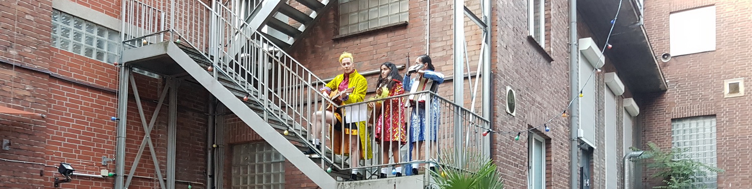 Dass es am Ende doch ausein­an­der­bricht, hängt wohl eher mit dem Bedürfnis des Kollektivs zusammen, ein Statement zu setzen. Positiv formu­liert, könnte man auch davon sprechen, dass es einen Epilog gibt. Nachdem sich die Situation in der Polizei-Akademie im Nebel aufgelöst hat, werden die Besucher in den Innenhof des Theaters gebeten. Dort haben die Akteure nochmals ihre Kostüme gewechselt, zu den Instru­menten gegriffen und stehen auf der Feuer­treppe, um dem Publikum ihr Lied von Techno­candy zum Besten zu geben. „Wir sind Techno­candy, habt keine Angst. Wir sind Techno­candy, habt Angst.“ Das haut einen nicht um, auch wenn es nett gemacht ist. Da ist dann schon der Abschluss stärker, wenn die jungen Leute das Lied der Moorsol­daten intonieren.