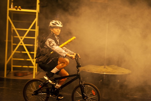 Die Ausgangs­si­tuation ist klar. Da gibt es eine Polizei-Akademie, sehr schön in Szene gesetzt von Debo Kötting, der zwei Türme und eine Drehscheibe auf die Bühne stellt, die Protago­nisten mit Fahrrädern, Helmen und parami­li­tä­ri­schen Kostümen ausstattet. Und da gibt es den Ausbilder Mave, darge­stellt von Haschemi, den Rekruten Dave, der von Müller verkörpert wird, und den Neuan­kömmling Rave, den Hourmazdi gibt. Da wird der Alltag in der Akademie darge­stellt, Patrouille-Fahrten, unsinnige Ausbil­dungs­ri­tuale, Wachdienst. Das ist alles handwerklich sauber gearbeitet. Von der Raumauf­teilung über den Nebel­einsatz bis zur Video­pro­jektion stimmt hier alles. Das einfach gestaltete Licht mag auch mit den Nöten des Saales zusam­men­hängen, der früher Malersaal genannt wurde, heute nur noch Saal 2 heißt.