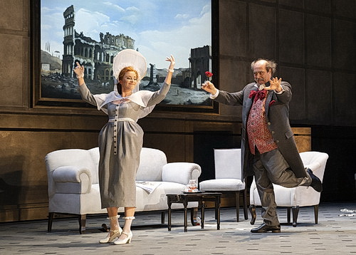 Die Personen und ihre Absichten sind bekannt: Don Pasquale, ein älterer Herr, ledig, reich und gelang­weilt, Norina, eine junge, attraktive Frau, verwitwet, auf der Suche nach „dem Einen“, am liebsten reich ausge­stattet, Ernesto, ein junger, feuriger Neffe des Hausherrn, dem Norina ausge­sprochen gut gefällt, Malatesta, der langjährige Freund und Berater des Don Pasquale, Carlotto, ein windiger Notar und Rechts­ver­dreher und schließlich der Kammer­diener, von Mykola Pavlenko umwerfend komisch als eine Art Szenen­clown gespielt.