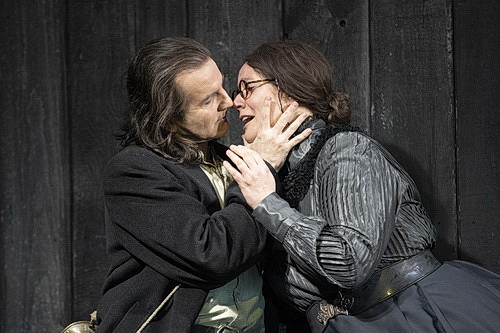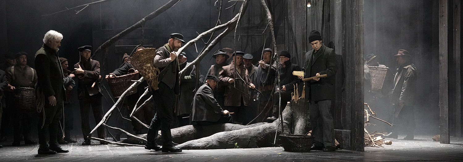Man sollte denken, dass nach der feurigen Begegnung zwischen Brünn­hilde und Siegfried am Ende des zweiten Abends von Wagners Ring des Nibelungen etwas Leben in das abgeschiedene Alpendorf einge­kehrt ist. Von wegen. Der Winter ist gekommen, das öffent­liche Leben ist nahezu vollständig erlegen. Die Holzfäller müssen arbeiten, um Brennholz zu sammeln. Die starken Scheite, die Brünn­hilde eigentlich erst nach fünf Stunden Oper fordert, sind schon überall aufge­schichtet. Die Bäume, zentrale Stützen der Häuser, sind gefällt und hinter­lassen nicht nur Baumstümpfe, sondern auch große Löcher in den Wänden. Wasser ist nur in der Form von Schnee verfügbar. Das einzige, was hier ab und an überhitzt wirkt, sind die Emotionen der Bewohner. Regisseur Paul Esterhazy und Drama­turgin Stephanie Twiehaus bringen den ersten kompletten Ring am Olden­bur­gi­schen Staats­theater auf gleiche Weise und am gleichen Ort zu Ende, wie sie ihn begonnen haben. Ein einsames Dorf irgendwo im Nirgendwo, das abgeschieden von den Krisen­herden am Vorabend des Ersten Weltkriegs nur um sich selbst kreist.