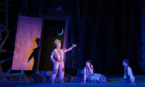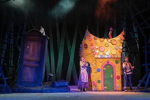 Die Bühne von Southgate umkränzt das Geschehen immer durch zwei Holzgerüste, so als blicke man durch Rahmen in eine andere Welt. Und die ist mit den wichtigsten Versatzstücken kindgerecht eingerichtet, es gibt einen Wald, ein Hexenhaus und es gibt die Engel, was ja heutzutage nicht unbedingt überall so ist. Lustig wirkt die Szene, als die Hexe mit einer Angel auf dem Schrank den Kindern ein kleines Hexenhaus vor die Nase hält, und das echte Haus parallel dazu hoch- und niederschwebt. Kleinigkeiten, die Spaß machen.