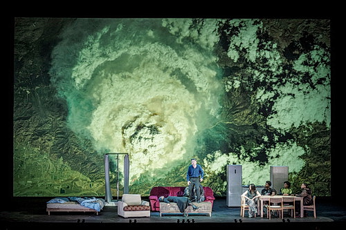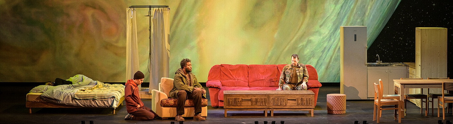 Nach eigener Aussage betrachtet der Regisseur Peter Sellars Castor et Pollux als die Geschichte des Überwindens von Krieg und Hass durch Brüderlichkeit und Liebe in einer zerbrochenen Gesellschaft und als das Erwachen einer neuen Generation, in der die Lebenden und die Toten versöhnt sind, in der es nicht mehr verschiedene Länder, sondern nur noch eine friedliche Welt gibt. Um mit Schiller zu sprechen könnte man sagen: „Alle Menschen werden Brüder … Seid umschlungen Millionen, diesen Kuss der ganzen Welt.“ Auf solch eine hochtrabende idealistische Ansage folgt dann meist eine Enttäuschung. Und beim Anblick des Eröffnungsdekors der Oper könnte man meinen, dass dem auch so sei: Eine von Plattenbauten umgebene, höchst banale Inneneinrichtung, einschließlich Riesenkühlschrank, Abwasch und Duschkabine. Doch dann verschwinden die Plattenbauten und Sellars nimmt das Publikum mit auf eine kosmische Tour. Im Laufe der Oper geht es von einer sehr wirklichkeitsnahen, nächtlichen Vorstadt mit seinem scheinwerfenden Autoverkehr, seiner Straßenbeleuchtung, über den Blick auf eine Öl-Raffinerie und Hochspannungsleitungen dann auf eine Wanderung ins Weltall, in der wir nicht nur unseren Planeten meist nächtlich von hoch oben, sondern auch andere noch farbenprächtigere Planeten sowie die verschiedensten Konstellationen der Milchstraße sehr eindrucksvoll vorgeführt bekommen, als wäre man in einem Observatorium zu Gast. All diese bunten Herrlichkeiten video-projiziert Alex MacInnis sehr realistisch und abwechslungsreich während der ganzen Oper wie ein nicht enden wollendes spektakuläres Kinoschauprogramm, auf den Hintergrund der Bühne. Davor spult sich die Handlung ab, innerhalb jener sehr banalen Inneneinrichtung. Auch sie bleibt während er ganzen Oper auf der Bühne und ist leider nicht banal genug, dass man sie völlig übersehen könnte. Auch lässt sich ihr Symbolwert nicht ergründen. Doch ist das glücklicherweise der einzige Stein des Anstoßes in einer sonst bemerkenswerten und sehr expressiven Inszenierung.