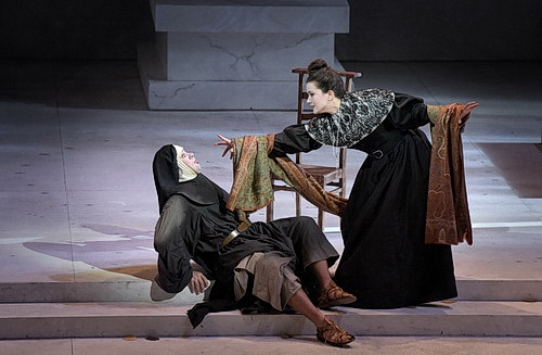 Philippe Talbot scheint für diese Tartuffe-Rolle des Comte Ory wie geschaffen zu sein. Als falscher Priester betört er gleich am Anfang des ersten Akts mit viel geschmeidigem Schmelz in einer salbungsvollen Predigt von der Kanzel herunter die weiblichen Schäfchen der Gemeinde mit seinen Worten der Liebe Que les destins prospères. Ein richtiger Tartuffe! Sogar die sonst so sittenstrenge Gouvernante Radegonde, hervorragend gespielt von Ève-Maud Hubeaux, gibt mit warmem, dunklem Mezzo ihrer Begeisterung Ausdruck. Er aber wartet auf die schöne Gräfin Adèle. Alle Frauen sind durch die lange Abwesenheit ihrer Männer liebeshungrig. Umso mehr verpasst Jean-Sebastien Bou, als der unablässig Schürzen jagende Diener Raimbaud, hier als Sakristan verkleidet, keine Gelegenheit, um sich an eine Schöne heranzumachen, besonders an die hübsche Alice in der Gestalt von Jodie Foster. Doch des Grafen strenger Erzieher, mit sonorem Bass von Patrick Bolleire gesungen, ist dem Tunichtgut auf der Spur, gibt aber auch lautstark zu verstehen, dass er es satt hat, ihn immer überwachen zu müssen Veiller sans cesse. Der junge Page des Grafen Isolier hingegen, eine Art Rossinischer Cherubino, charmant und witzig gespielt und in den Spitzentönen mühelos gesungen von Gaëlle Arquez, hat ganz andere Probleme: er hat sich in jugendlichem Ungestüm in die schöne Gräfin Adèle verliebt und sucht im komischen Duett Une dame de haut parage bei dem falschen Priester Rat. Dieser ist nicht begeistert, einen Rivalen zu entdecken, aber hofft, es sich zu Nutze zu machen. Schließlich erscheint die schöne Gräfin Adèle und legt in einer großen Szene mit Chor die Beichte ihres Leidens ab. Julie Fuchs singt mit viel Empfindung und stimmlich sehr schön ihr En proie à la tristesse. Doch ist ihr Spiel etwas zu verhalten. Die Situation wirkt fast schon tragisch, bis die Handlung ab dem Celeste providence in hinreißenden Koloraturen wieder ins Komische zurückgleitet. Denn durch die Worte des falschen Priesters zur Liebe ermutigt, entbrennt die Gräfin plötzlich in Liebe, allerdings zum Leidwesen des Comte Ory, zum jungen Pagen Isolier. Noch dazu fliegt jetzt die Maskerade des Comte Ory auf, man verkündet, die heimkehrenden Kreuzfahrer seien nur noch zwei Tage entfernt und alles ist in totaler Konfusion im Finale des ersten Akts. Doch der Comte Ory will die Verführung der Gräfin Adèle keineswegs aufgeben, er hat ja noch zwei Tage Zeit.
