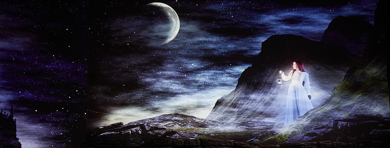 „Ich habe mich begeistern lassen von der gotischen Romantik des Werkes, die sehr dazu angetan ist, eine visuelle Traumwelt zu schaffen … Und in der Dame Blanche ist auch die Magie interessant“, verspricht Regisseurin Pauline Bureau, aber ihre magische Traumwelt fällt etwas schmächtig aus. Denn die Dame Blanche, die zu Anfang im Mondlicht der schottischen Heidelandschaft herumgeistert und sich dann wieder in Luft auflöst, schafft nur vorrübergehend ein traumhaft-romantisches Bild, aber keine anhaltende Traum-Atmosphäre. Ebenso wenig, wenn sie am Ende der Oper wie eine dea ex machina, weiß leuchtend und segenspendend, aus der Versenkung emportaucht. Auch die verschiedenen magischen Tricks, die auf der Bühne verpuffen oder durch die Gegend fetzen, lassen keine dauerhafte magische Stimmung aufkommen. Sogar die Kindergemälde in der alten Burg, die in ihrem Rahmen lebendig werden, sind zu realistisch, um fantastisch zu wirken, aber sie helfen sicherlich dem gedächtnisgestörten Helden, die Erinnerung an seine Kindheit wiederzufinden.
