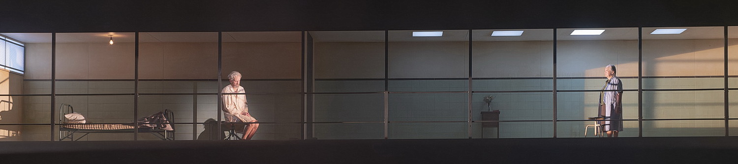 Aber Bellorini ist einer etwas obskuren Vision verfallen, die ihn etwas Zeitgenössisches, etwas aus dem Rahmen Fallendes erfinden lässt. Um es zu erreichen, „ergänzt“ er die Oper mit einer Art Rahmenerzählung und beauftragt den Schriftsteller Wilfried N’Sondé, den Text dazu zu schreiben. Die Rahmenerzählung spielt in einer psychiatrischen Anstalt anno 2023, in der Saul sich befindet. Diese Klinik, streng geometrisch, hell beleuchtet und aseptisch-sauber, taucht hin und wieder bildlich als Obergeschoss auf und steht stilistisch im krassen Gegensatz zu dem Bühnenbild der Oper darunter.