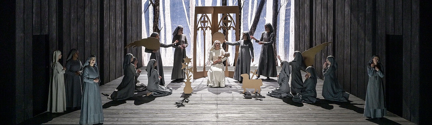Olivier Py hat mit seiner Regie-Arbeit von 2013 eine ganz karge, minima­lis­tische, aber durchaus dem Thema entspre­chende Insze­nierung geschaffen. Pierre André Weitz‘ Bühne ist meist leer und düster, durch Verschieben der Zwischen­wände und durch Verän­derung der Beleuchtung entstehen neue Räume und Stimmungen. Requi­siten sind sparsam einge­setzt: ein Kronleuchter im Hause des Marquis, einige Stühle im Kloster. In der Sterbe­szene der Äbtissin wird ihr Bett, wie von oben gesehen, auf die Hinterwand versetzt. Manche Szenen spielen im Kloster­garten, der durch hohe, nackte Bäume angedeutet ist. Die Gewänder sind eher zeitlose Straßen­kleider für die Zivilisten und graue Nonnen­ge­wänder, nur Constance und Blanche sind ganz in weiß. In der Schluss­szene tragen alle Nonnen weiße Hemden. In den litur­gi­schen Zwischen­spielen werden von den Nonnen mit einfachen Mitteln lebende Bilder aus dem Neuen Testament darge­stellt: Die Verkün­digung, Christi Geburt, das letzte Abendmahl, die Kreuzigung.