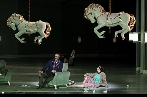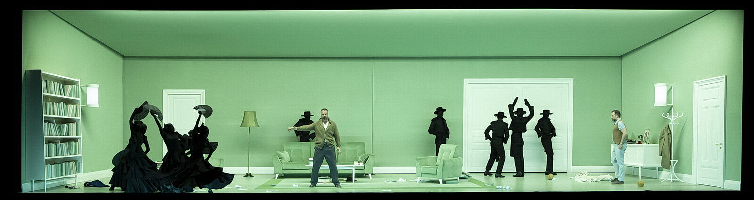 Der Regisseur Damiano Michie­letto hat mit seinem Team eine sehr wider­sprüch­liche Insze­nierung der Oper geschaffen. Einer­seits versucht er, mit entspre­chender Personen-Regie und mit einigen poetisch-roman­ti­schen Regie­ein­fällen, wie mit den bunt bemalten Karussell-Pferden oder mit den kohlpech­raben­schwarzen, gesichtslos tanzenden Gespenstern à la Goyas Caprichos – wohl die inneren Schre­ckens­bilder Don Quichottes darstellend – dem gefühl­vollen Melodrama und Massenets Musik gerecht zu werden. Anderer­seits, versetzt er die Handlung in die zwar relativ elegante, aber völlig unter­kühlte, ja, fast aseptische Atmosphäre eines modernen Wohnzimmers der 60-er Jahre. In diesem bühnen­fül­lenden Raum bewegt sich Don Quichotte, träumt, brütet vor sich hin, trinkt viel, schluckt verzweifelt Pillen und lebt in seinen Erinne­rungen. Wenn die ihn hinaus­treiben, erweitert sich auch der Raum nach hinten, immer noch mit demselben Dekor, und dort spielt sich dann der Kampf mit den Windmühlen ab, das Zusam­men­treffen mit der Räuber­bande oder die Nachtclub-Partys von Dulcinées Freun­des­kreis. Ebenso wenig wie Wasser und Öl sich mischen, lassen sich auch diese beiden gegen­sätz­lichen Atmosphären nicht mischen, was besonders im fünften Akt, in der sehr lyrischen, aber eisig grell beleuch­teten Sterbe­szene des Helden, allzu offen­sichtlich wird. Die Kostüme sind den 1960-er Jahren nachempfunden.