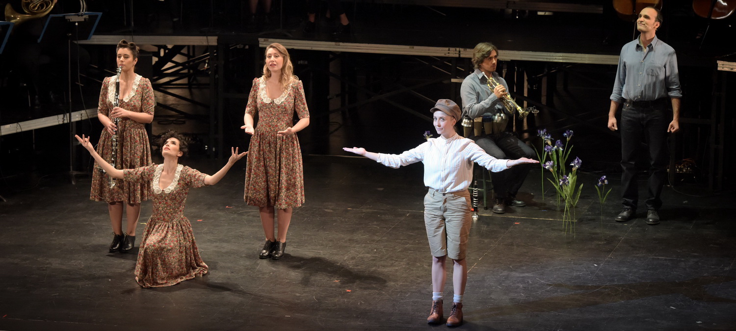 Auf drei Leinwänden auf der rohen Hinterwand der Bühne geben Videos für jeden Darsteller entweder ihren Text auf Französisch wieder oder zeigen dazu entsprechende Bilder. In der zweiten Szene verliebt sich Michael in Mondeva, eine Art Papagena Stockhausens in exotisch-schillerndem Paradiesvogel-Gewand. Diese Szene ist von kindlicher Poesie. Die zwei Instrumentalisten Michael/Trompete und Mondeva/Bassetthorn tanzen umeinander herum, intrigiert und verwundert, bis die Mond-Eva schließlich in ihrem Raumschiff die Erde wieder verlässt. Henri Deléger begeistert durch die Nuancen und Vielfalt der Töne, die er mit oder ohne die sechs Dämpfer seiner Trompete entlockt und Iris Zerdoud durch die samtenen Töne ihres Bassetthorns. Es ist auch die einzige Szene, in der Lazar eine der Protagonisten fantasievoll kostümiert. Ansonsten tragen alle sehr nüchterne Alltagskleidung. In der dritten Szene steht Michael vor der Jury der dreifachen Aufnahmeprüfung ins Konservatorium. Er erzählt dreimal seine Kindheit: Erst singt er sie aus der Sicht seiner Mutter, dann als Trompeter aus der Sicht des Vaters. Und er begeistert schließlich endgültig seine Jury, als er sich tanzend als Kind selbst darstellt. Wieder ist hier eine sehr poetische Szene gelungen. In einer ausdrucksstarken Choreografie, die Tanz und Mimik verbindet, sieht man regelrecht, wie das Kind lauter Geschichten erzählt. Bezaubernd verspielt getanzt von Emmanuelle Grach.