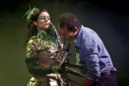 Der zweite Akt ist Michaels Weltreise, die ihn von Köln, über New York, Japan, Bali, Indien, Zentral Afrika nach Jerusalem führt. Auf jeder dieser Stationen „unterhält“ sich der Trompeter Michael mit Teilen des Orchesters, die auf der Vorderbühne vorbei paradieren. Denn das Orchester bedeutet die Welt. Denn „für Stockhausen ist die Musik die Welt“, sagt Lazar, und Stockhausen sei der Meinung gewesen, die Musik hätte die Kraft, Menschen zu verändern. Er habe auch versucht, aus einer Synthese verschiedener musikalischer und theatralischer Formen aus aller Welt eine Art universelle Kunst und universelle Musik zu schaffen, in einem neuem, ihm eigenen Stil. Letzteres ist wohl entscheidend: Es bleibt eine Stockhausen sehr eigene Ton-Sprache, denn man sucht vergeblich in diesem zweitem Akt etwaige „lokal-exotische“ Elemente, wie etwas das Gamelan aus Bali oder den Jazz aus New York. Bei den Kostümen ist Lazar bei der Nüchternheit geblieben und folgt nicht den Regie-Vorschlägen Stockhausens, der beispielsweise das Orchester während der Weltreise als Pinguine auftreten lassen möchte, die Klarinettistinnen als Schwalben oder andere Instrumentalisten als Clowns. Als Michael die letzte Station seiner Reise erreicht, hört er aus weiter Ferne das Bassethorn. Er antwortet in einem langen, sehnsuchtsvollem lamento, begleitet von einer gezupften Bassgeige. Sofort bricht er seine Reise ab, begibt sich auf die Suche nach der fernen Geliebten und findet sie. Was folgt, ist, auch klanglich, eine höchst reizvolle, aber auch sehr komische Szene. Es sieht aus wie der extravagante Hochzeitstanz zweier Vögel, der nach vielen Pirouetten, Verbeugungen und Anschmiegungen in einen unisono und gemeinsamen Triller endet, der die Vereinigung darstellt. Dieser zweite Akt ist rein instrumental. Und wieder muss man die Probenarbeit loben, denn es wird ja hier von den Instrumentalisten gefordert, sich wie Schauspieler auf der Bühne aufzuführen und dabei ihr Instrument zu spielen, obendrein auswendig, was bei Sängern und Sängerinnen normal, bei Orchestermusikern jedoch ungewöhnlich ist.