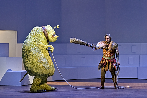 Die beiden Regisseure, Valérie Lesort und Christian Hecq kommen vom Theater und sind offensichtlich entschlossen, richtige Schau-Spiele zu schaffen. Nach ausgiebigen Recherchen haben sie sich an die Arbeit gemacht. Natürlich mussten sie vereinfachen, denn mindestens drei Dekors für jeden der fünf Akte wie bei der Uraufführung, ist heute nicht mehr denkbar. Auch mussten sie sich die Frage stellen, wie kann man solche eine komplizierte, antike Geschichte dem breiten Publikum schmackhaft machen. Ohne das Werk zu verändern, haben sie sich im Gegenteil von der reichhaltigen Symbolik, von den Bildern, die die griechische Sage heraufbeschwört, aber auch von dem, was das 17. Jahrhundert dafür an Maschinerie auf die Bühne gebracht hat, inspirieren lassen. Und dann haben sie ihrer Fantasie freien Lauf gelassen, fühlten sich jedoch immer einer gewissen Ästhetik, einer gewissen Poesie und auch einem gewissen Humor verpflichtet. Vieles sieht aus, als sei es einem inspiriertem Kinderbilderbuch entsprungen. Bis zuletzt mussten sie zittern, ob auch alles, was sie ausgeklügelt hatten, richtig funktionieren würde, doch alles läuft genauestens wie am Schnürchen ohne jegliche Panne. Das Publikum hält den Atem an und muss jede Minute auf der Hut sein, nicht irgendetwas zu verpassen, denn ein origineller oder witziger Regie-Einfall jagt den anderen. Schon bei seinem ersten Auftritt erscheint Hercules mit einem grünen Ungeheuer an der Leine, das man bei Maurice Sendak suchen könnte. Dann entpuppt sich Venus aus einer Rosenblüte, die plötzlich aus der Versenkung auf die Bühne wächst. Juno hingegen sitzt entweder rittlings auf einem Pfau oder schwebt hoch über dem irdischen Geschehen in einer Pfauen-Montgolfiere. Und auf der ganz weiß gehaltenen geometrisch-einfachen Bühne, die wie ein Amphitheater nach hinten abgeschlossen ist, wachsen immer wieder Pflanzen mit bunten Blüten oder erschreckenden Krallenhänden. Iole und Hyllus, das Liebespaar, singen ihr Liebesduett auf Säulen hoch über der Bühne stehend, während Venus in einem rosafarbenen Piepmatz darüber ihre Kreise dreht. Es wird unheimlich, wenn Säulen oder Möbelstücke anfangen, lebendig zu werden oder sogar zu tanzen. Oder wenn vom Chor nur die Köpfe zu sehen sind, die in einer Wand stecken. Es sollen sich einige der Ausführenden anfänglich gegen diese akrobatischen Leistungen gewehrt haben, aber schließlich haben alle erfolgreich gelernt, auch im Schweben, auf einer Säule stehend oder wie Neptun und der aus den Fluten gerettete Hyllus aus der Luke einer Art Unterseeboot à la Jules Vernes ihre Arien zu singen. Nichts bleibt ihnen erspart, sogar der Chor muss in der Meeresszene in schwarzweißgestreiften Badeanzügen, Modell 1900, in den blauen Bilderbuchwellen kraulen oder verwegene salto mortale darbieten. Die Szene des Schlafgottes als erschöpftes Michelin-Männchen ist von einer unwiderstehlichen, zarten Komik. In der Schlussapotheose, als Herkules und die Schönheit hoch in den Sternen hängen und singen, gibt es sogar noch ein kurzes Feuerwerk auf offener Bühne. Dem Publikum wird für sein Geld viel geboten. Und das Publikum ist sehr vergnügt darüber.