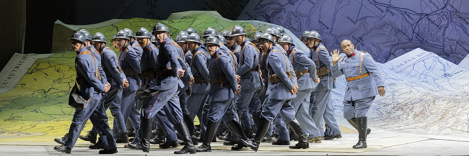 La Fille du Régiment ist eine der ersten Opern, die Donizetti für Paris komponiert, aber sie findet erst langsam ihren Weg zum Erfolg. Es ist die bekannteste „Kriegsoper“ des 19. Jahrhunderts, in der sich das Martialische mit dem Romantischen mischt. Sie erzählt die Geschichte von Marie, die während der napoleonischen Kriege von einem französischen Regiment als Baby auf einem Schlachtfeld gefunden und adoptiert wird. Sie wird damit erst das verhätschelte Maskottchen und dann die burschikos-schlagfertige Marketenderin des Regiments. Tirol ist von den Franzosen besetzt, die Bevölkerung auf der Flucht und da verliebt sich Marie ausgerechnet in den Tiroler Bauernbuben Tonio und er sich in sie. Um ihn zu heiraten, muss sie nun erst das Regiment für die Idee gewinnen, und Tonio erklärt sich sogar bereit, ihr zuliebe ins Regiment einzutreten. Dann entdeckt man aber ihre adelige Herkunft und erst nach weiteren burlesken Enthüllungen erreicht sie schließlich doch noch ihr Ziel.