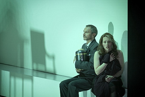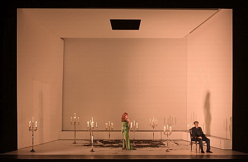 Damiano Michielettos Inszenierung der Oper ist zu uneinheitlich, als dass man global darüber urteilen könnte. Die Dekors sind ganz einfach: Im ersten Teil eine hell erleuchtete, weiße Schachtel, in der sich alles abspielt, im zweiten Teil ist es eine dunkle Bühne mit einem korallenroten Geflecht von Parzenfäden als Hintergrund.