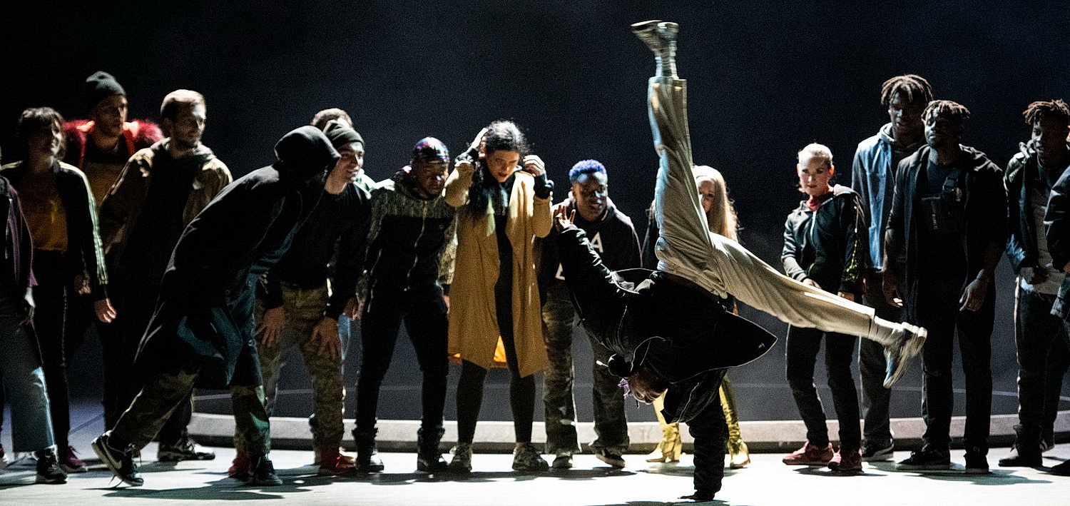 Der Choreograf Bintou Dembélé ist einer der bekanntesten Tanzkünstler der Hip-Hop-Bewegung in Frankreich. Die Mitglieder seiner Tanz-Truppe vertreten von Hip-Hop über Break Dance, Electro, Waaking, Joking bis hin zu Krump alle modernen Straßentänze. Seine vorliegende Choreografie ist in den ersten drei Bildern weitgehend statisch, das heißt, man springt und läuft nicht, sondern stehend verrenken die Tänzer und Tänzerinnen, oft auf einfachen Podesten stehend, wild ihren Körper und wirbeln mit den Armen und mit dem Kopf, oder sie drehen sich und winden sich am Boden. Oder aber sie erstarren – wohl in Anlehnung an die im 18. Jahrhundert üblichen lebenden Bilder – zu Statuen. Letzteres wird besonders deutlich im ersten Bild, wo man am Anfang bunte Meissen-Porzellan-Figuren auf der Bühne zu sehen glaubt, oder etwas später erinnern die Schiffbrüchigen erstaunlich an Rodins berühmte Skulpturen-Gruppe der Bürger von Calais. Erst im vierten Bild wird Dembélés Choreografie dynamisch. Und dann ist die Hölle los.