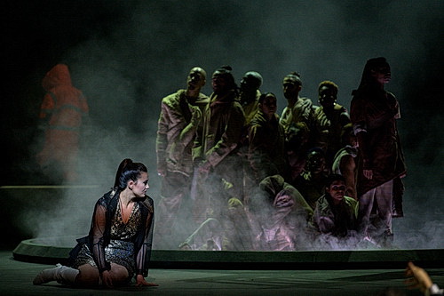 Im dramatischen Höhepunkt dieses Bildes, während Alexander Duhamel als fanatischer Hohepriester Huascar den Sonnengott beschwört, bricht der Vulkan aus. Derselbe Riesenkran holt dazu feurige Lava aus der Tiefe, und die Tänzerinnen wirbeln wild wie schwarze Hexen gegen das gleißende Licht ihre langen Haare durch die Luft. Devieilhe singt Phani und Stanislas de Barbeyrac den Carlos.