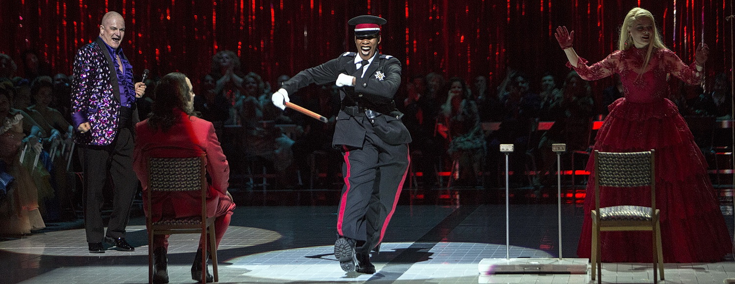 Auch Regisseur Krzysztof Warlikowski trägt den Ruf eines Spezialisten für die Darstellung expressiver Frauenrollen und gesellschaftskritische Werke. Insbesondere aber auch als Erneuerer des Theaters in Sinne Shakespeares. Eine kräftige Bildsprache und ausgefeilte Personenführung gehen mit diesem Ruf einher. Die Bühnen- und Kostümbildnerin Malgozata Szczesniak arbeitet und unterstützt ihn mit ihren subtilen, kreativen Schöpfungen, die vordergründig ästhetisch schwer lastende Anklagen verpacken. So lassen die beiden die Handlung in einem Schlachthof spielen. Hell ausgeleuchtet, steril weiß gefliest sind die Bühnenwände, ein beweglicher transparenter Container in der Mitte zeigt die persönlichen Räume von Katerina Ismailova in vollkommen ungeschützter Privatsphäre. Ein Abbild der gesellschaftlichen Rolle der Frau, dem Willen und der Begierden des Mannes schutzlos ausgeliefert. Zu Beginn werden ein paar frisch geschlachtete Schweinehälften aufgehängt zur weiteren Verarbeitung hereingefahren. Der Chor in weißen Mänteln und Hauben macht sich adrett an die Arbeit. Alles wirkt sauber und wohlgeordnet, aber der Zerfall fängt leise an zu bröckeln, und das Chaos entwickelt sich unaufhaltsam ebenso wohlgeordnet. Dabei spielen die Lichtregie von Felice Ross wir auch die Videos von Debis Guégin eine wichtige Rolle. Im blutroten Kleid und Anzug wird geheiratet, die Bluttat bleibt aufdringlich präsent, auch wenn noch ausschweifend gefeiert wird, lastet sie über Serguei und Katerina. Weniger überzeugend wirkt die Umsetzung im letzten Bild. Statisch aufgereiht, dunkel eingehüllt die Atmosphäre des Zuges der Sträflinge. Die Sinnhaftigkeit des omnipräsenten Containers in der Bildmitte wird hierbei nicht klar erkennbar. Die finale Verzweiflungstat entzieht sich dem Betrachter, erst die Wiederholung der einleitenden Videos und die auflösende Musik führen zur Handlung zurück und berühren.
