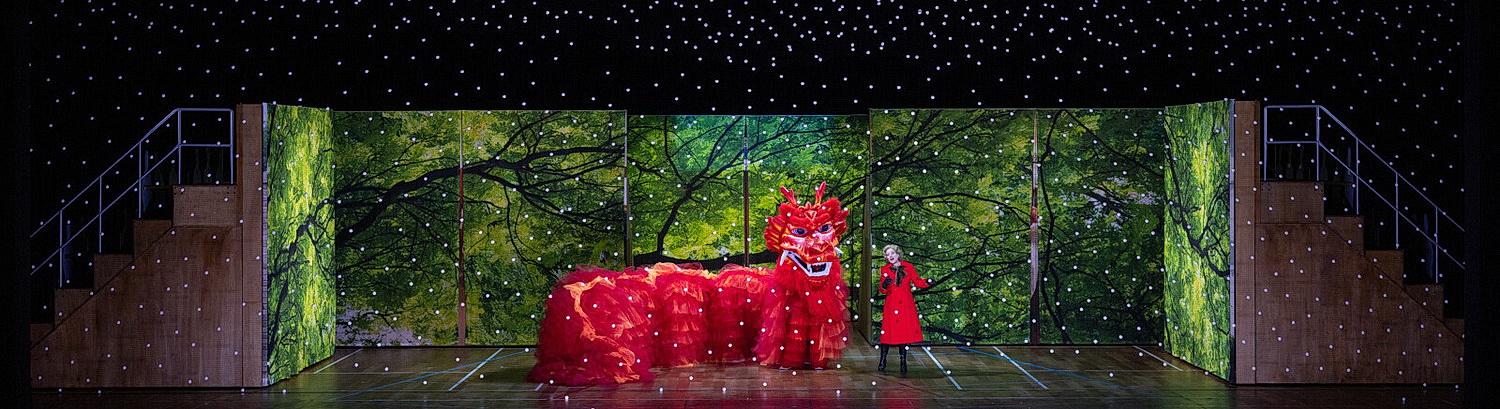 In der ersten Szene absolviert Pat Nixon das spouse program des Staatsbesuchs, wird in eine Glasbläserei, in ein Spital und dann in eine Schweinefarm geführt – alles geschickt durch anschauliche Videos untermalt. Schließlich ist sie ganz allein auf der Bühne, Schneeflocken in Form von Hunderten von weißen Tischtennisbällen füllen den Himmel aus. Nur ein freundlicher, anhänglicher chinesischer Drache leistet ihr Gesellschaft. Mit etwas naiver Intuition sinniert sie über die Bedeutung dieser Reise. Es ist entschieden die poesievollste Szene in Carrascos Inszenierung und Renée Fleming füllt sie mit ihrer wundervoll lyrischen Stimme stimmungsvoll aus: This is prophetic!