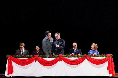 Im Obergeschoss einer großen Bibliothek mit Clubsesseln werden die Gäste mit Mao Tse-tung und seiner Frau bekannt gemacht, während im Untergeschoss Regime-Gegner gefoltert werden. Es wird über Philosophie, Ideologie, Politik gesprochen. Jeder erklärt sich bereit zu verstehen, aber niemand hört dem anderen zu. Doch die Stimmung ist harmonisch. John Matthew Myers gibt einen glaubwürdigen gealterten Mao ab und singt in einem Tauben-Dialog mit Nixon vor sich hin: Our armies do not go abroad, immer von seinen drei jungen Sekretärinnen bestätigt und umsorgt. Beim anschließenden Festessen singt Xiaomeng Zhang als Tschu En-lai mit sehr schön timbriertem, warmem Bariton die Festrede Ladies and gentlemen, comrades and friends. Thomas Hampson als Richard Nixon gibt sich selbstsicher, aber muss immer wieder Pillen schlucken, um bei der Sache zu bleiben. Mit imposanter, kraftvoller Baritonstimme singt er seine Antwort Mr. Premier, distinguished guests. Als Mahl beginnt es, wird dann zum öffentlichen Tischtennis-Turnier und endet in einer allgemeinen Rauferei.