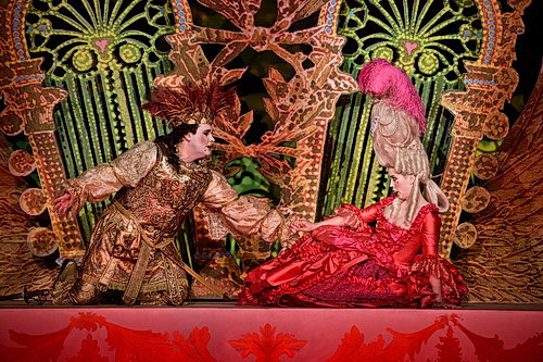 Das possenhafte Werk kommt dem Wesen des etwas burlesk-dandyhaften Schauspielers und Regisseurs Michel Fau sehr entgegen. Mit sehr viel Phantasie bis hin zum Surrealistischen hat er sich des Postillon de Lonjumeau angenommen, damit das heutige Publikum davon ebenso begeistert sei, wie seinerzeit das des 19. Jahrhunderts. „Was mich hier begeistert, ist die Geschichte der Oper in der Oper. Und so habe ich mich entschlossen eine gepflegte, ein bisschen affektierte, etwas dekadente, fantastische, übertriebene, farbige, ja sogar übersättigte Inszenierung vorzubereiten“, sagt er selbst dazu. Und er hat Wort gehalten. Vor blumenreichen, bunten und etwas ländlich-naiv gemalten Bühnenbildern, besonders reizvoll in hellem Grün und Violett im dritten Akt, spult er ein Schauspiel ab – halb gesungen, halb gesprochen – voll reizender Einfälle, burlesker Tänze und närrischer Szenen. Bei ihm liegen Tragödie und Komödie ganz eng neben einander. „Ich spreche immer von Tragödie, wenn ich mit Sängern an einem burlesken Register arbeite wie beim Postillon. Denn Tragödie ist es, wenn der Held, der von dem, was ihm geschieht, überfordert ist, ebenso ist es im Vaudeville oder in der Posse. Die Personen werden verrückt durch das, was ihnen geschieht. Nur flößt eine solche Situation in einer Tragödie Angst ein, während sie in einem Vaudeville zum Lachen bringt“, sagt Fau. So ist man auch während der ganzen Oper nie ganz sicher, ob ein ernstes Geschehen auf der Bühne nicht schon ins Lachhafte, ins Groteske übergekippt ist. Und meistens ist es der Fall, aber immer sehr subtil. Am köstlichsten vielleicht die Karikatur der barocken Oper in der Oper mit ihren übertriebenen Gesten, aufwändigen Kostümen und Federbüschen auf dem Kopf. Man braucht sich da bei Christian Lacroix keine Sorgen zu machen, dass er nicht alle Formen, alle Farben, alle Muster ausgeschöpft hat, um die ländliche Gesellschaft, die Hofgesellschaft und vor allem natürlich die Hauptdarsteller, vage im Stile Ludwigs XV., mit den buntesten und extravagantesten Bekleidungen auszustaffieren.