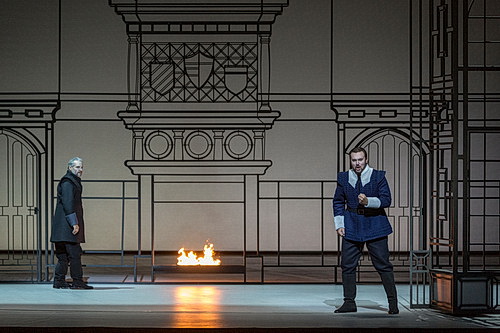 Laurent Pellys Inszenierung ist immer noch sehenswert. Puritanisch karge, kunstvoll ausgearbeitete Metallgerippe stellen die Burg dar, in der die Handlung abläuft. Sie besteht aus Treppen, Galerien, Räumen, Türmen, es gibt sogar im zweiten Akt einen virtuellen Kamin, in dem ein Feuer brennt. Diese Burg ähnelt einem komplizierten System von Käfigen, die auch einzeln auf die Bühne gestellt werden können. Im Übrigen dreht sich das Ganze um die eigene Achse, wenn das Geschehen es erfordert. Durch einfache Beleuchtungseffekte kann diese Burg zur Silhouette werden, Schatten werfen oder im Licht erstrahlen. Die Atmosphäre und die Beleuchtung sind eiskalt, bieten aber oft reizvolle Schattenrisse des sich drehenden Bühnenbilds. Schlicht und einfach sind die stilisierten Kostüme des 17. Jahrhunderts. Die Choreografie des Chors ist eher einfallslos.