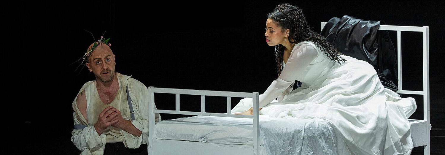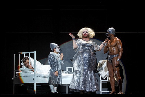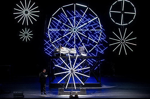 Olivier Pys Inszenierung der Oper von 2008, die hier wieder aufgenommen wird, ist intellektuell, nüchtern und eiskalt. In Pierre-André Weitz‘ Dekor wird die Bühne hinten durch ein abstraktes Zick-Zack-Muster aus weißleuchtenden Neonröhren begrenzt, davor bewegen sich von Bild zu Bild Stangengerüste und Treppen hin und her und bilden eine Ober- und eine Unterbühne, was der Akustik nicht unbedingt zugutekommt. Auf der Oberbühne steht jederzeit ein weißes Bett bereit. Auch die Wundermaschine am Ende der Oper ist aus weißen Neonsternen zusammengesetzt, die sich sogar drehen. In den Liebes- oder Orgienszenen findet man keinerlei warme, geschweige denn heiße Sinnlichkeit. Auch die Jahrmarktszene, die Stravinsky und Diaghilev vierzig Jahre früher in Petruschka szenisch und musikalisch mit so viel Charme und Poesie auf die Bühne gezaubert hatten, ist unterkühlt. Keinerlei Rummelplatz-Atmosphäre. Der einsame Jongleur und der emsige, einsame Zwerg wirken statisch und verloren, während die drei Glamour-Girls aussehen, als seien sie einem Eispalast entsprungen. Die Kostüme sind schwarz oder weiß oder glitzernd silberfarben, sonst findet man fast keine Farben. Die Bühne ist meist dunkel gehalten, nur von einigen Scheinwerfern oder den Neonröhren beleuchtet.