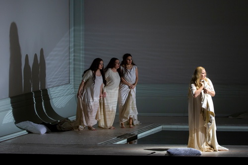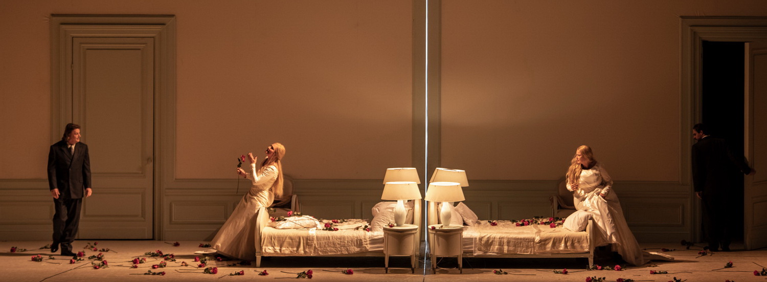 Rusalka ist ein archetypischer Mythos, bei Dvořák und Kvapil in der Form eines Volksmärchens. Man hätte von der Inszenierung einen solchen Stoffes etwas Magisches, Zauberhaftes, Geheimnisvolles erwarten können. Doch Robert Carsen und sein Team sehen die Welt der Rusalka anders, bei ihnen ist sie prosaisch, kühl-ästhetisch und sexuell geprägt. Der Teich im Schlosspark, dem die furchterregenden Wasserwesen entsteigen sollen, wird zu einem seichten rechteckig eingefassten Wasserbecken. Das Königsschloss eine Reihe von trostlos, leeren Räumen, in denen wie eine Zwangsvorstellung mit Nachttischlämpchen rechts und links immer wieder das Doppelbett auftaucht: umgekehrt und gespiegelt am Plafond oder waagerecht am Boden. Carsens Magie beschränkt sich auf ein Spiel mit geometrisch-symmetrischen Spiegelungen und Verdoppelungen, voll von einer nicht immer verständlichen Symbolik. Hin und wieder etwas kühle Erotik, aber keine schwüle Sinnlichkeit. Der Schlaf der Rusalka ist in Ballett-Form vom Kampf der Geschlechter bevölkert. Anders als bei Dvořák, dessen Musik weitgehend im Volkstümlichen wurzelt, ist Carsen offensichtlich mehr darauf bedacht, das Tiefenpsychologische der Geschichte zu ergründen als ein Märchen zu illustrieren. Erst im dritten Akt bietet auch er uns durch ganz einfache Mittel ein wenig magischen Zauber, als durch ein Videospiel über Rusalka hinweg, die ganz allein auf der dunklen, leeren Bühne steht, Wellen wie Wolken hinwegziehen, oder etwas später, als die drei Nymphen durch ähnliche Lichteffekte ganz von Wasser umgeben scheinen. Doch auch diese Atmosphäre wird zerstört, als plötzlich da hinein wieder das Ehebett auftaucht, in dem, diesmal senkrecht gestellt, gemütlich die Hexe Ježibaba liegt und gute Ratschläge erteilt. Man hat nicht erwartet, dass Carsen einen mit Algen geschmückten Wassermann und fischschwänzige Nixen auf die Bühne bringt, aber die tadellos geschnittenen, dunklen Anzüge und die ewigen langen, weißen Nachthemden tragen auch nicht zum Märchenhaften bei. Erstaunlich, dass man in den 17 Jahren, in denen diese Inszenierung nun in Paris immer wieder auf die Bühne kommt, noch nichts anderes ausprobiert hat.