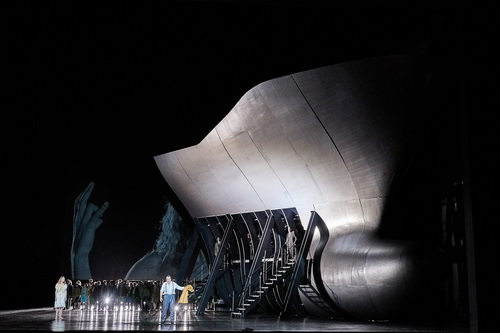 Vieles in der Inszenierung, die Calixto Bieito und sein Team bieten, ist unklar und wird es wohl bleiben. Mag sein, dass sich der Regisseur von der Hafenstadt Genua hat inspirieren lassen, um während der vier Teile dieser düsteren, mit Intrigen durchwobenen, melodramatischen Oper ein Ungeheuer auf die Bühne zu stellen. Dieses Ungeheuer sieht aus wie der Bug eines Hochseedampfers, der aus Stahl und Neon in einem Trockendock zusammengestellt wird. Es dreht sich fast unentwegt und schafft auf diese Weise verschiedene Bühnenräume, die den Fiesco-Palast, den Ratssaal im Dogenpalast oder was sonst noch andeuten sollen. „Denken Sie daran, in dem ganzen Werk ist die Gartenszene die einzige etwas heitere. Alle anderen sind ernst, feierlich oder düster“, schreibt schon der Textdichter Arrigo Boito warnend während der Entstehung des Werkes an Guiseppe Verdi. Von wegen Garten, hier wird uns nicht einmal eine Pflanze gegönnt! Was entsteht, ist eine eiskalte, unmenschliche Atmosphäre, in der die Darsteller und der Chor ohne erkennbare Choreografie etwas ziellos im Halbdunkel der Bühne herumirren, wenn sie nicht auf Stiegen in die oben Stockwerke des Schiffsgerippes hinaufsteigen. Die Personenführung ist stellenweise wenig erfreulich: Die in Todeskrämpfen zuckende Maria wird, auf einer Plastikplane liegend, von ihrem Vater quer über die Bühne geschleift, oder der vergiftete Doge hält sich, wie im Endstadium des Morbus Parkinson, nur noch schwer und stark zitternd auf den Beinen. Weder die Beleuchtung noch die Kostüme sind in irgendeiner Weise originell, die Portrait-Videos völlig überflüssig.