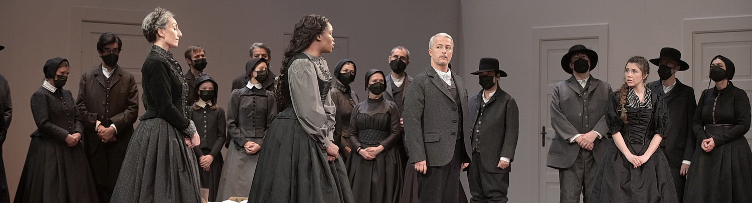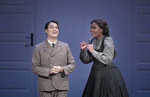 Die südafrikanische Sopranistin Pretty Yende, die sich in Paris schon vor zwei Jahren als Violetta offenbart hat, durchläuft als Amina von himmelhoch jauchzend bis zu Tode betrübt alle Register ihrer reichen Stimme. Vom silbern-zarten Come per me sereno zu Beginn der Oper bis jubelnd-triumphierend, alle Melismen mühelos durchlaufend in der cabaletta des Finales. Schauspielerisch berührt sie durch ihre fast kindliche, unglaublich ausdrucksstarke Vitalität und Spontaneität sowohl in der Freude als auch im Leid. Francesco Demuro ist regiebedingt etwas steif und geschniegelt, aber singt den Elviro mit elegantem, schneidend klarem Tenor, wie in Prendi, l’anel ti dono, in der auch seine hohen Register gut zur Geltung kommen, oder feurig, wie in der cabaletta Domani, apene aggiorno. Alexander Tsymbalyuk ist mit warmer, voller Bassstimme der ausgleichende, vermittelnde Graf Rodolfo. Ob Verdi sich wohl der schönen lyrischen Arie Rodolfos Il mulino … il fonte … il bosco erinnert hat, als er die Arie des Giorgio Germont im zweiten Akt von La Traviata schrieb? Annunziatas Vestris hat eine kräftige Mezzosopran-Stimme, die in der Gespenster-Erzählung fast etwas Unheimliches annimmt. Sie spielt und singt überzeugend die Rolle der mutigen Ziehmutter Teresa, die als einzige ihren Schützling verteidigt. Sandra Hamaoui ist stimmlich wie schauspielerisch glaubhaft die frustrierte Lisa, die auch den Elviro heiraten möchte und ihrem Unglück in der pastoralen Eingangs-Kavantine Tutto è giosa, tutto è festa … sehr schön Ausdruck verleiht. Marc Scofoni ist mit selbstgerechter Standhaftigkeit der Gemeindevorsteher Alessio.